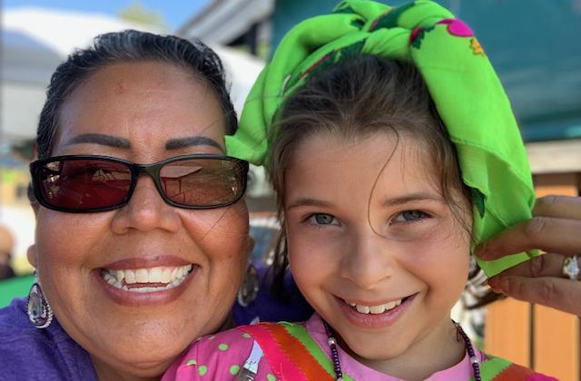 Cheryl Whiskeyjack and niece Infinity Rahko-Pitawanakwat wearing a kohkum scarf. Photo courtesty of Cheryl Whiskeyjack.