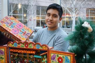 Sebastian Palomino Jiménez (Quechua) tiene 16 años y es originario de Lima, Perú. Recientemente se mudó a Massachusetts con su familia, con quien esculpe, pinta y construye mundos en forma de retablos (cajas de retablos). Estas escenas de historias expresivas se venden en forma de pequeñas, medianas y grandes piezas que continúan la tradición de la familia.