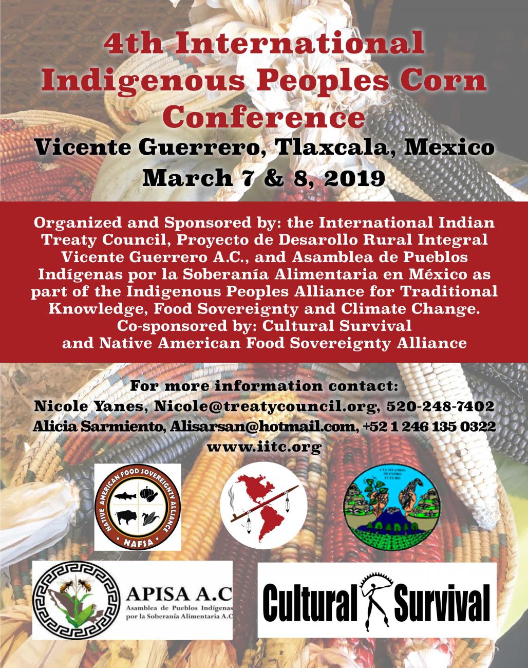 4th International Indigenous Peoples Corn Conference will take place in Vicente Guerrero, Tlaxcala, Mexico on March 7 & 8, 2019. It will be organized and sponsored by: the International Indian Treaty Council, Proyecto de Desarollo Rural Integral Vicente Guerrero A.C., and Asamblea de Pueblos Indígenas por la Soberanía Alimentaria en México as part of the Indigenous Peoples Alliance for Traditional Knowledge, Food Sovereignty and Climate Change.