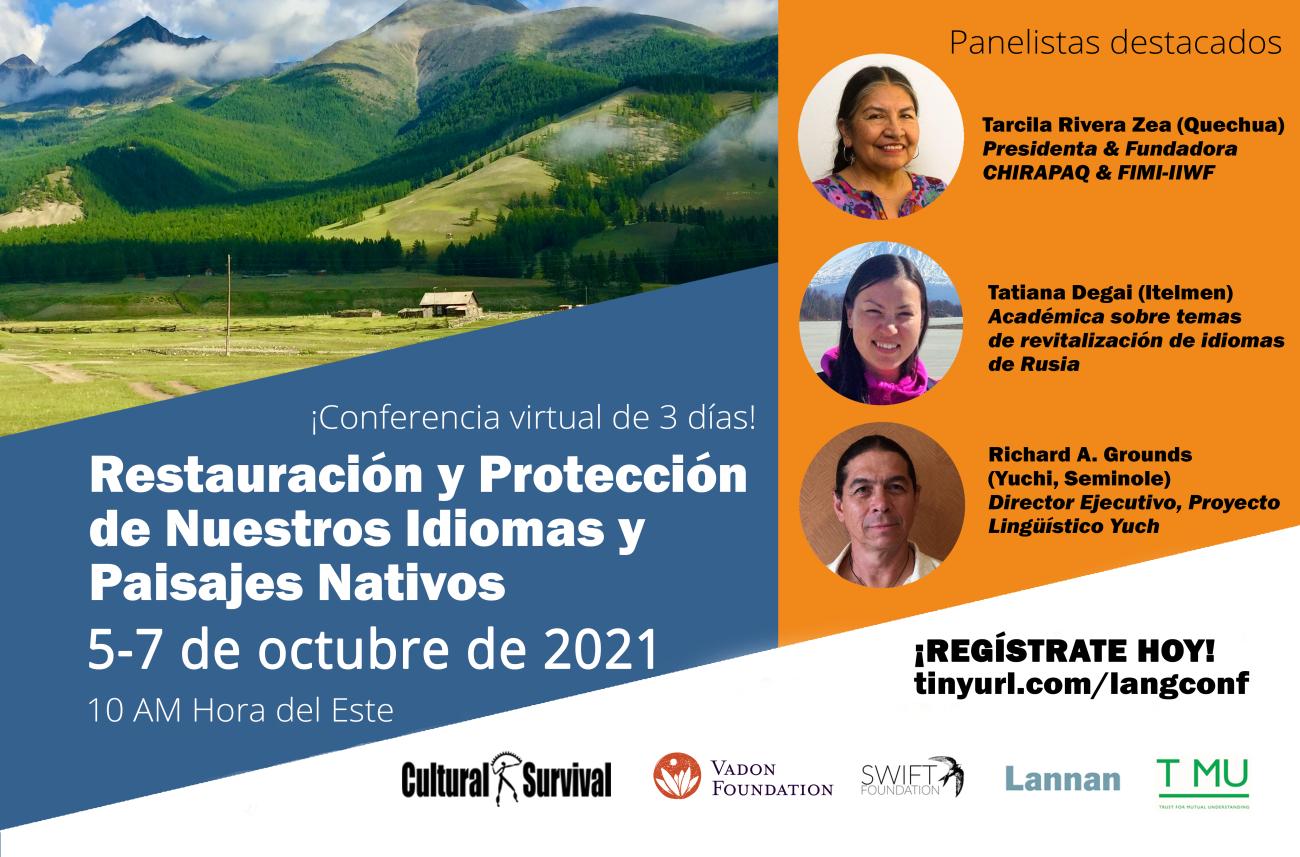 A la luz del próximo Decenio Internacional de las Lenguas Indígenas de las Naciones Unidas, Cultural Survival se complace en anunciar su próxima conferencia virtual de 3 días, "Restauración y protección de nuestros idiomas y paisajes nativos", del 5 al 7 de octubre de 2021. Esta conferencia facilitará a quienes trabajan a nivel comunitario con herramientas y mejores prácticas para revitalizar y fortalecer los idiomas Indígenas y el conocimiento ecológico tradicional que llevan consigo.