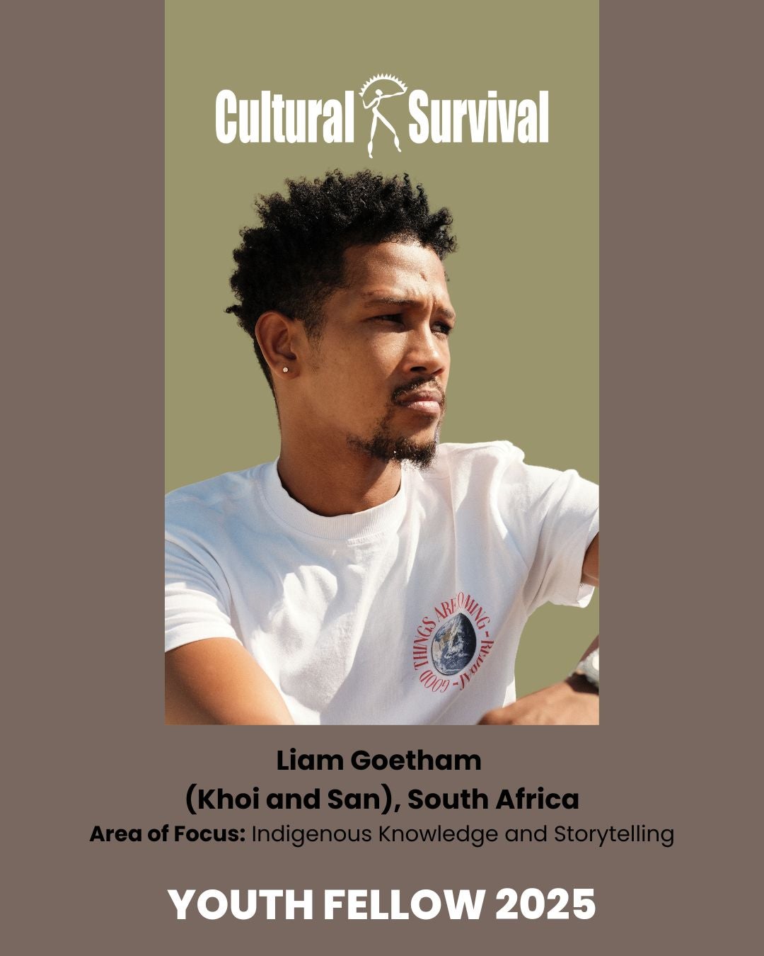 Liam Goetham (Khoi and San) is a cultural activist and storyteller from the Khoikhoi First Nation Cocoqua in Paarl, Western Cape, South Africa. He is dedicated to revitalizing Indigenous languages, knowledge, and storytelling. Driven by a deep desire to understand the origins of his people, he joined the Munanai Collective, a community of Khoikhoi artists and activists who use the arts to challenge the erasure of Khoikhoi identity, language, and culture. Through his journey, Goetham discovered that his ancestors are represented in ancient rock art across Southern Africa, and that the Khoikhoi language, once widely spoken, has been systematically silenced. He believes that the voices of Indigenous Khoikhoi youth are vital to the khaima (resistance) against this erasure. As a result, he is committed to preserving his ancestral language and reclaiming the stories of his people before colonization.