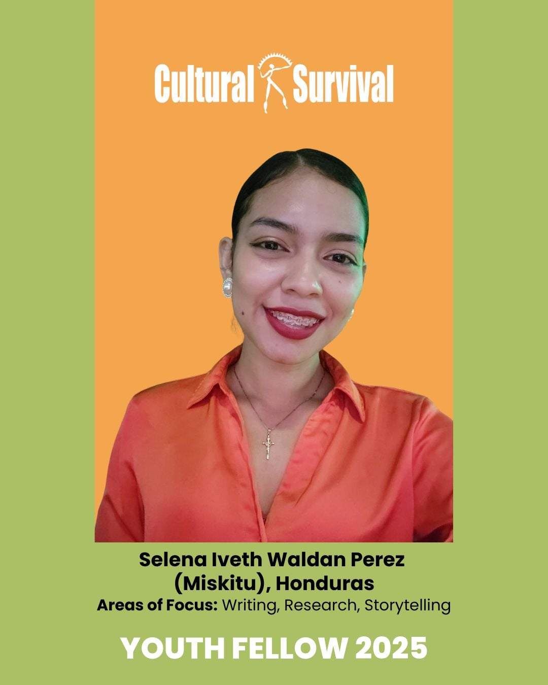 Selena Iveth Waldan Pérez is originally from the Miskitu ethnic group in Gracias a Dios, Honduras. She is currently pursuing a degree in Education. In addition to her studies, she serves as the President of the Municipal Youth Commission of Puerto Lempira and is a member of the Board of Directors for the Afro-Indigenous Youth Network of Honduras. For the past two years, she has volunteered in various civil society initiatives. Perez aspires to share the rich history of her beautiful region of diverse communities and Nations, aiming to raise awareness about the importance of caring for and preserving Indigenous cultures.