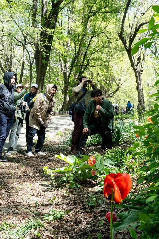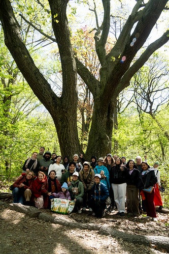 Oliver Lopez is the caretaker of the Bird Sanctuary at Riverside Park Conservancy and a passionate activist for Indigenous rights and lands. He guided attendees through the Bird Sanctuary, pointing out the native flora and fauna, while Lalama translated the tour into Spanish. Under the dappled canopy of budding trees and new leaves, Lopez invited the group into five minutes of silent meditation. Eyes closed, the group breathed in the fragrance of early spring and leaned into the chorus of warbling white-throated sparrows and the sharp calls of blue jays.