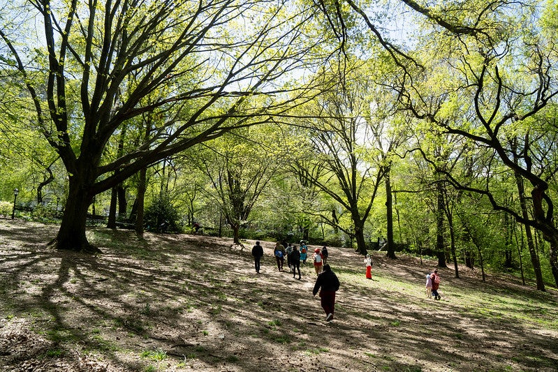 The Bird Sanctuary is a forested area within Riverside Park that stretches from 116th Street to 125th Street. Its wide walking trail is heavily used by the public all year round. Some people race through the trails as part of their running route, some enjoy a stroll through the tranquil space, and others take their time in the forest to immerse themselves in nature and observe several species of birds calling the forest home. On this particular spring morning, the Bird Sanctuary became the focal point for people representing Indigenous communities around the globe.