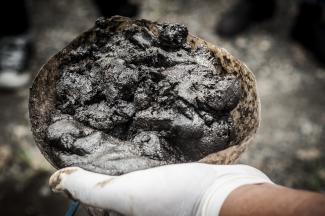Photo: A sample of the crude still present in the soil. Photos by Mattia Polisena.