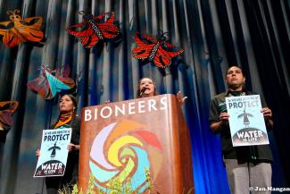 Photo: Tara Houska, Kandi Mossett, and Dallas Goldtooth present an update on the situation at Standing Rock at the October 2016 Bioneers Conference. Photo by Jan Mangan.