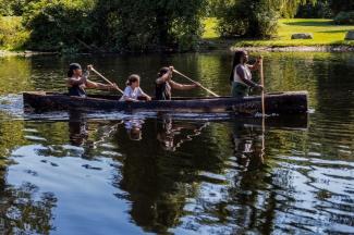 Tribal communities from southeastern Connecticut recently created the largest mishoon made in over 400 years. Fourteen paddlers launched the mishoon in the Mystic River, including members of the Wampanoag, Shinnecock, Narragansett, Schaghticoke, and Pequot Tribes. This was the largest New England mishoon that paddled from Mystic Seaport to Noyak Beach. At each stop, canoe families follow common protocols, which includes asking permission to come ashore, often in their Native languages.