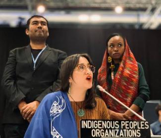 Top photo: Freddy Sébastian Medina, Kera Sherwood-O'Regan (center), and Hindou Oumarou Ibrahim advocating on behalf of Indigenous Peoples' organizations at COP25 in Madrid, Spain. Photo by Jason Boberg.