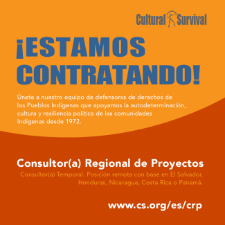 Cultural Survival es una organización no gubernamental sin fines de lucro registrada en EE.UU. Nuestro liderazgo es de raíces Indígenas y defendemos los derechos de los pueblos Indígenas apoyando su autodeterminación, culturas y la resiliencia política de las comunidades indígenas desde el año 1972. Durante 50 años, Cultural Survival se ha asociado con comunidades para promover los derechos y las culturas de los pueblos indígenas en todo el mundo. El centro de nuestros esfuerzos se basa en los principios de apoyar, amplificar y crear conciencia sobre la autodeterminación de las comunidades indígenas. Cultural Survival ha creado una sólida red de asociaciones con comunidades Indígenas que abarcan más de 70 países. Nuestro trabajo se basa en la Declaración de las Naciones Unidas sobre los Derechos de los Pueblos Indígenas (DNUDPI).