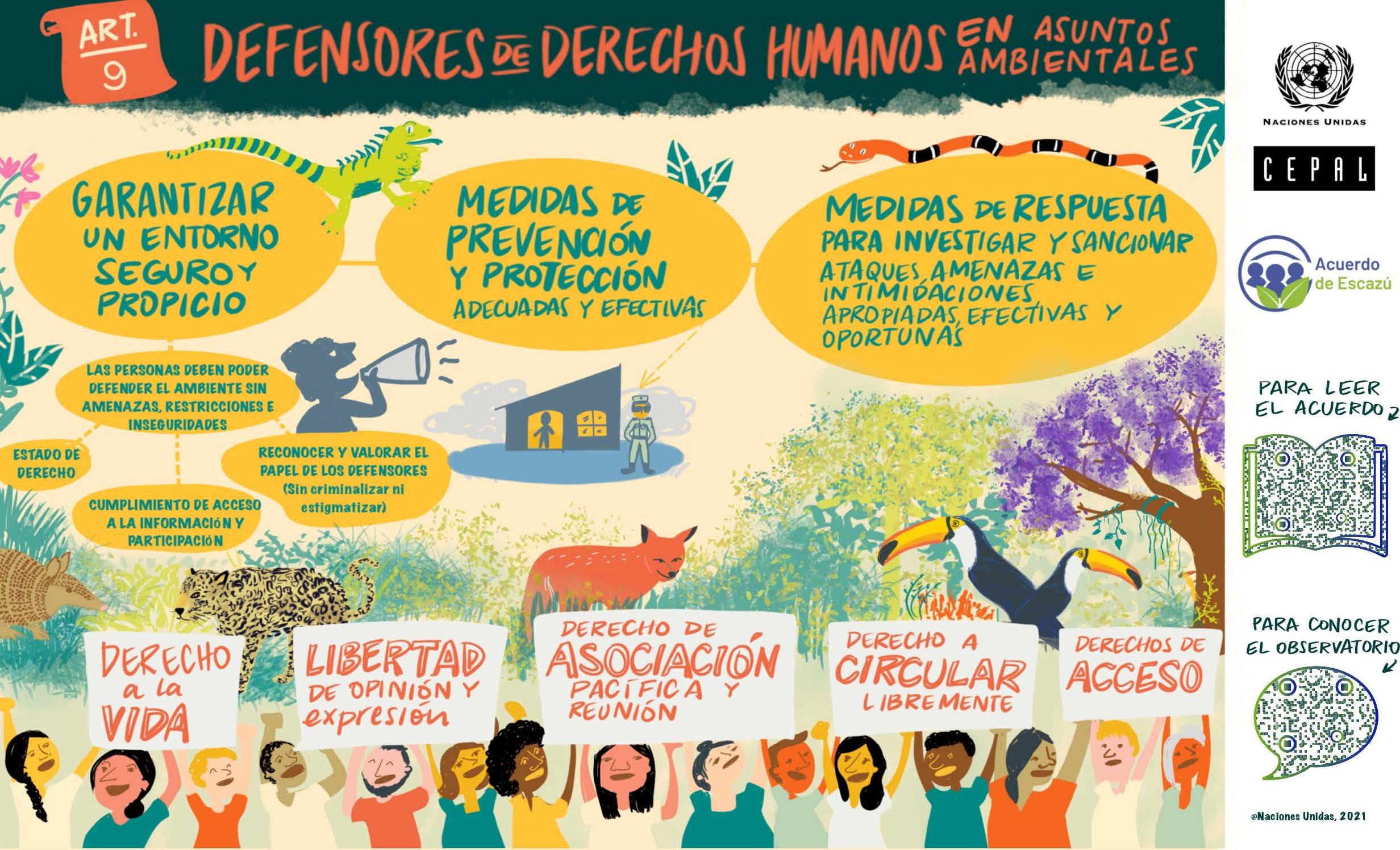 El Acuerdo de Escazú es el primer tratado vinculante que incluye disposiciones sobre personas defensoras del medio ambiente. Esto es de especial importancia ya que el acuerdo cubre una de las regiones geográficas más peligrosas para ser una personas defensora de derechos humanos ya que tres de cada cuatro asesinatos de personas defensoras del medio ambiente tienen lugar en América Latina. El Acuerdo obliga a los estados a tomar medidas efectivas para reconocer, proteger y promover todos los derechos de personas defensoras de derechos humanos en cuestiones medioambientales e investigar y castigar los ataques, amenazas o intimidaciones en su contra.