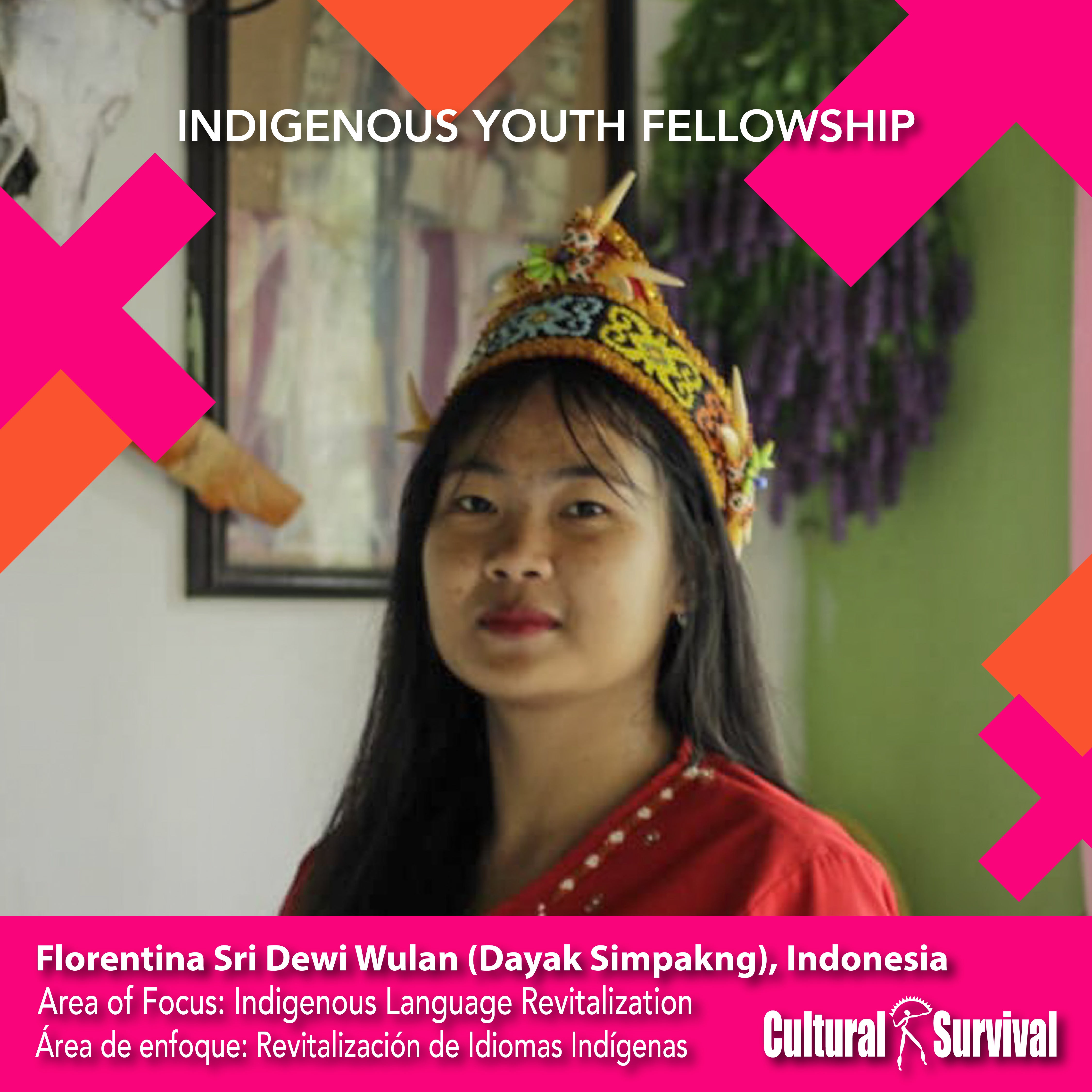 Florentina Sri ‘Dewi’ Wulandar nació en Tahak, Indonesia. A nivel local, ella es conocida como Dewi, y su nombre local especial es "Ragak", que significa "la que teje cesta de ratán”. En 2021, se graduó cum laude en Historia de IKIP Pontianak. Ella es escritora y utiliza esta habilidad para dar a conocer las historias, conocimiento y sabiduría de su cultura y del pueblo Dayak. Más allá de esto, Dewi ha contribuido a revistas académicas, escribiendo artículos sobre temas que van desde “La existencia de la joven generación Dayak en el esfuerzo de conservación forestal en Ketapang Regency” a “La tradición oral de la comunidad Dayak Simpakng en la gestión de la pandemia”. Ahora ayuda a su hermana Dessy a enseñar en Arus Kualan, el centro no formal de educación en la escuela tradicional y específicamente, alienta a los jóvenes dayak a escribir y registrar las historias de su gente.