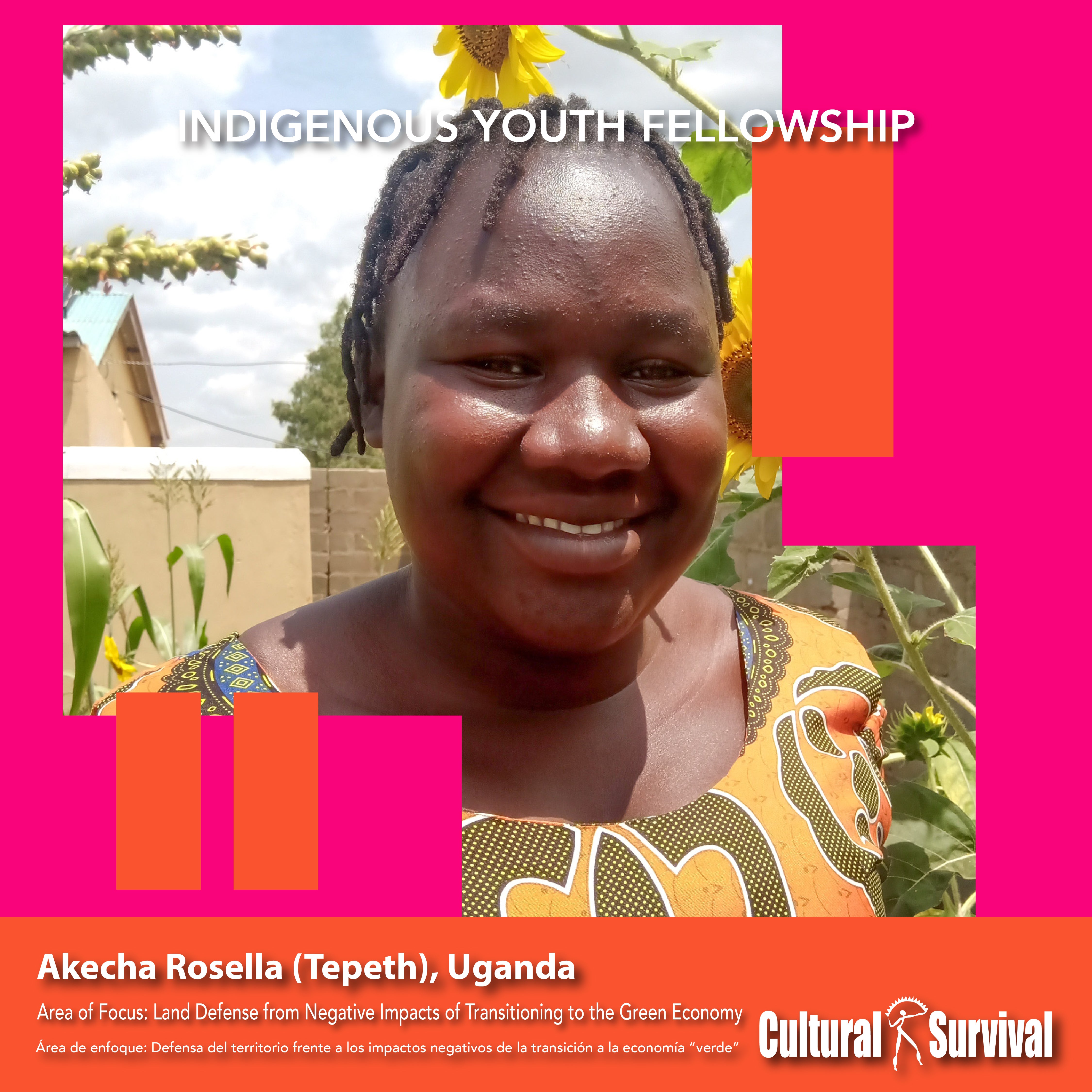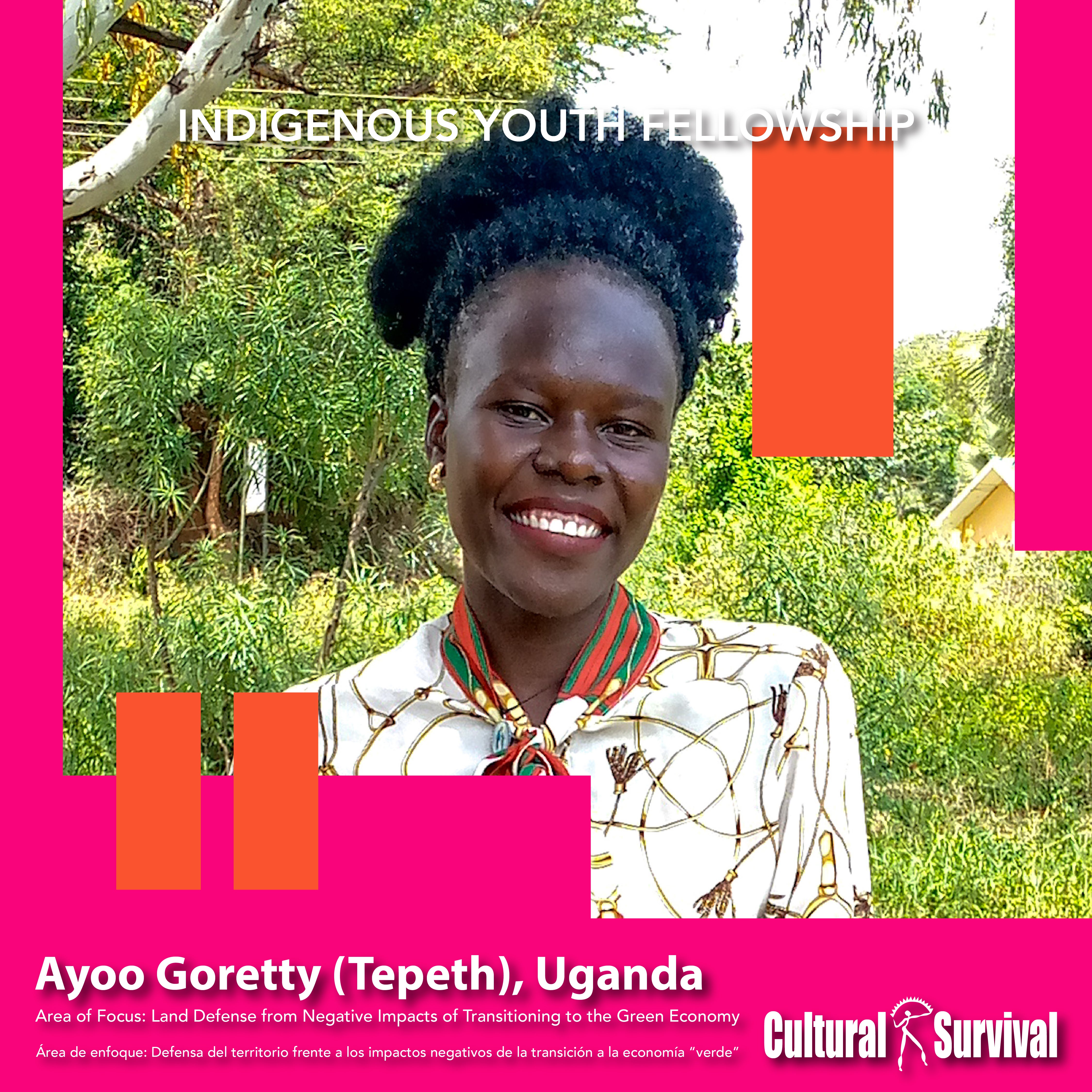 Ayoo pertenece a la tribu Indígena conocida como Tepeth, en el distrito de Moroto (Uganda). Su lengua se llama "Soo". Ayoo es una joven defensora y promotora del desarrollo comunitario, con experiencia en el trabajo con comunidades Indígenas. Ayoo es una defensora que ha movilizado a la gente de su comunidad para defender su territorio.