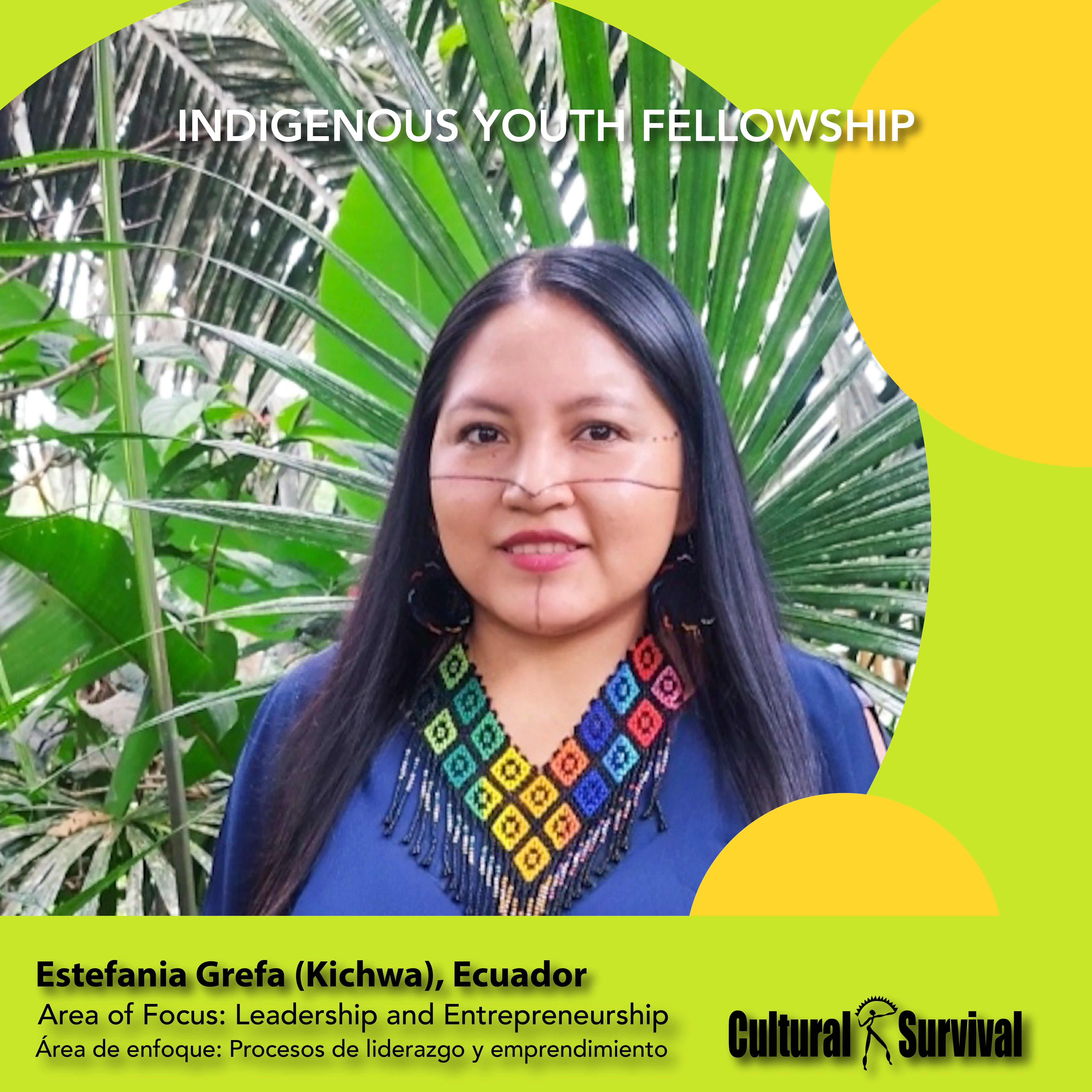 Erika Estefanía Grefa Sarango es una mujer kichwa y vive en la comunidad de Unión Base, sede de la organización regional amazónica de La Confederación de las Nacionalidades Indígenas de la Amazonia Ecuatoriana (CONFENIAE), ubicada en la parroquia Puyo, provincia de Pastaza, Ecuador. Tiene experiencia y estudios en turismo, medio ambiente, gastronomía ancestral y comunicación social comunitaria.