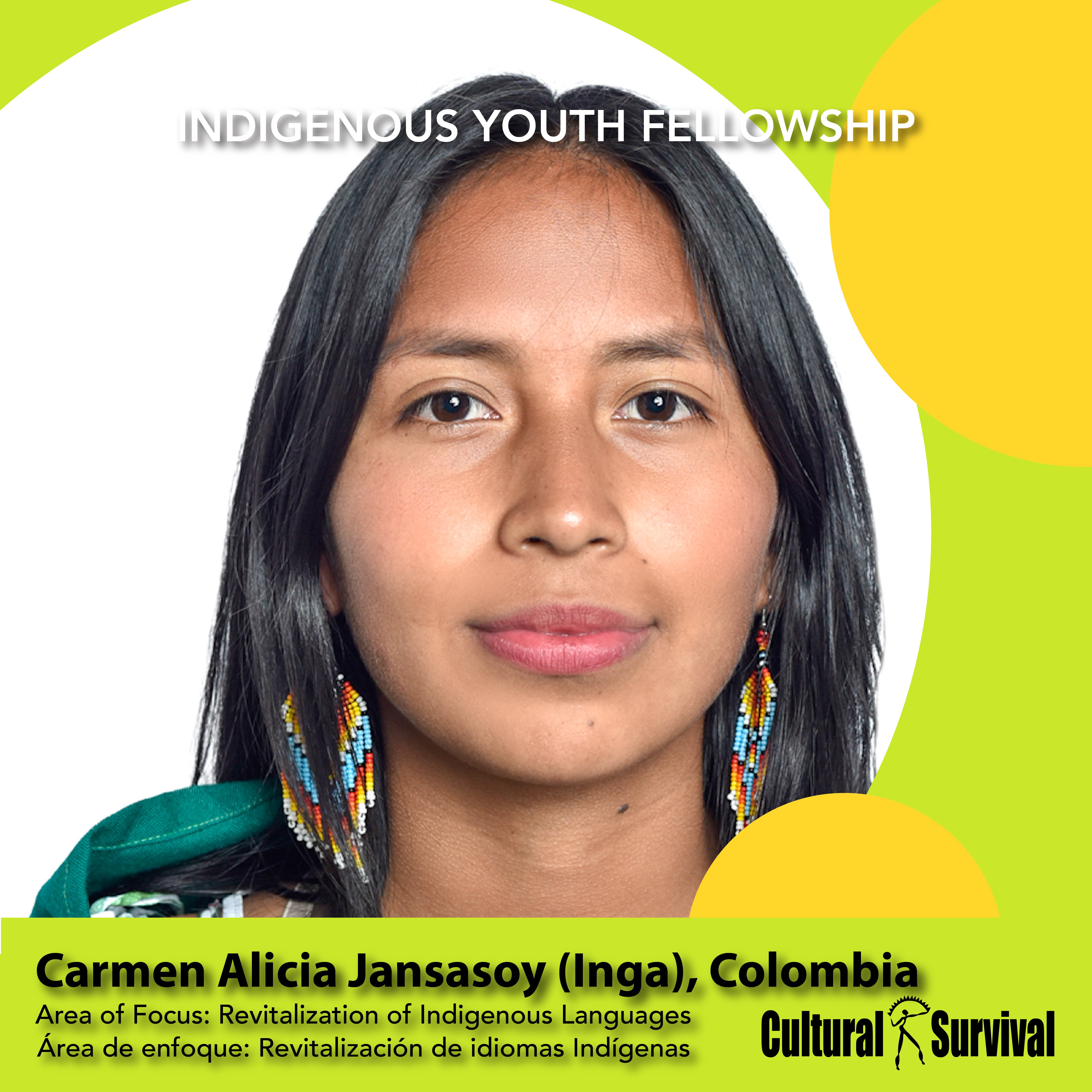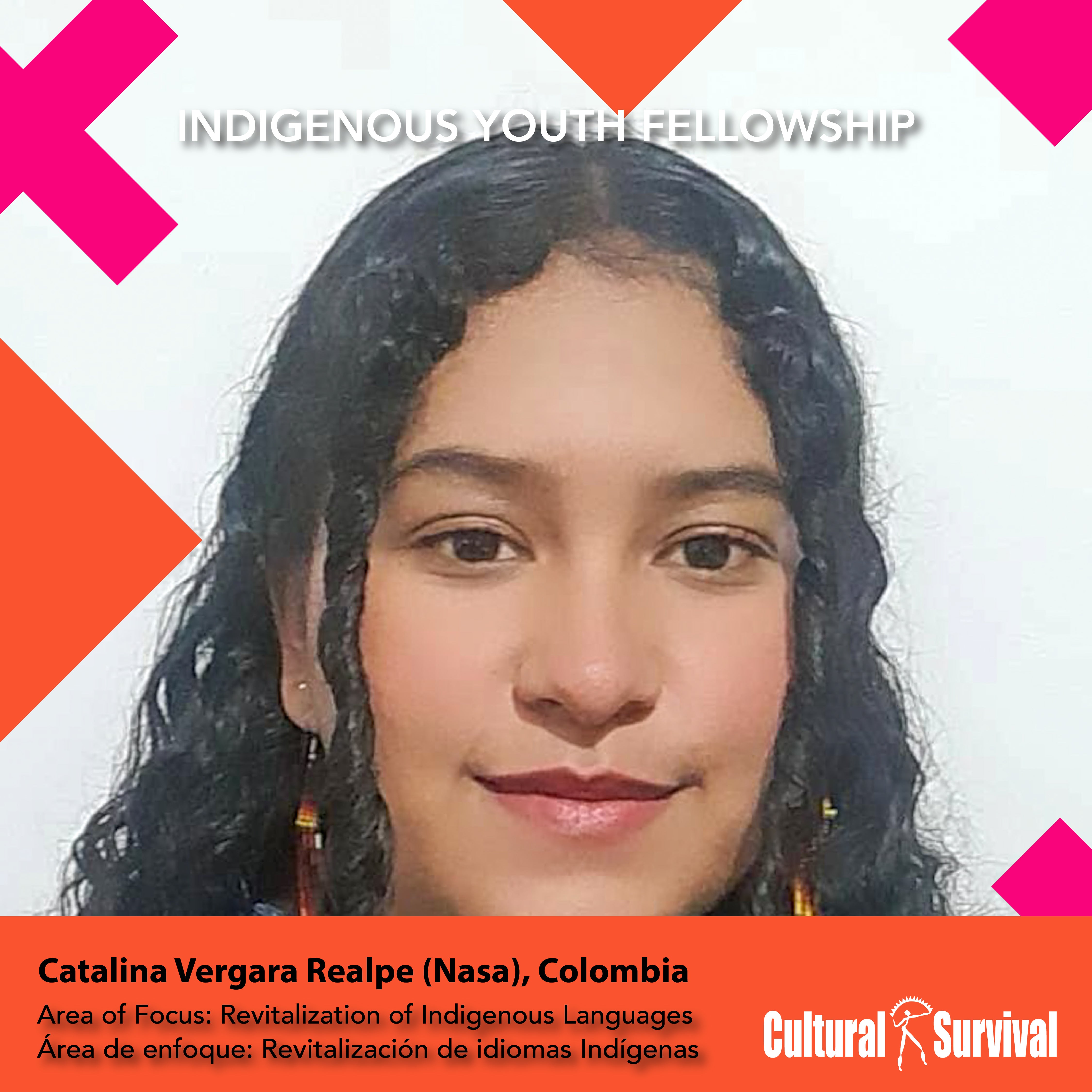 Catalina Vergara Realpe, Nasa, nació en la pintoresca ciudad de Cali, situada en el hermoso Valle del Cauca, Colombia. Sin embargo, creció la mayor parte de su infancia en las tierras de Ecuador, donde ahora reside en el Resguardo Indígena Paniquita de Colombia. Ella es un espíritu con los pies en la tierra profundamente conectado a las tierras y los sistemas de agua de la tierra que la ha guiado para convertirse en un líder en la defensa de los derechos de los jóvenes Indígenas.