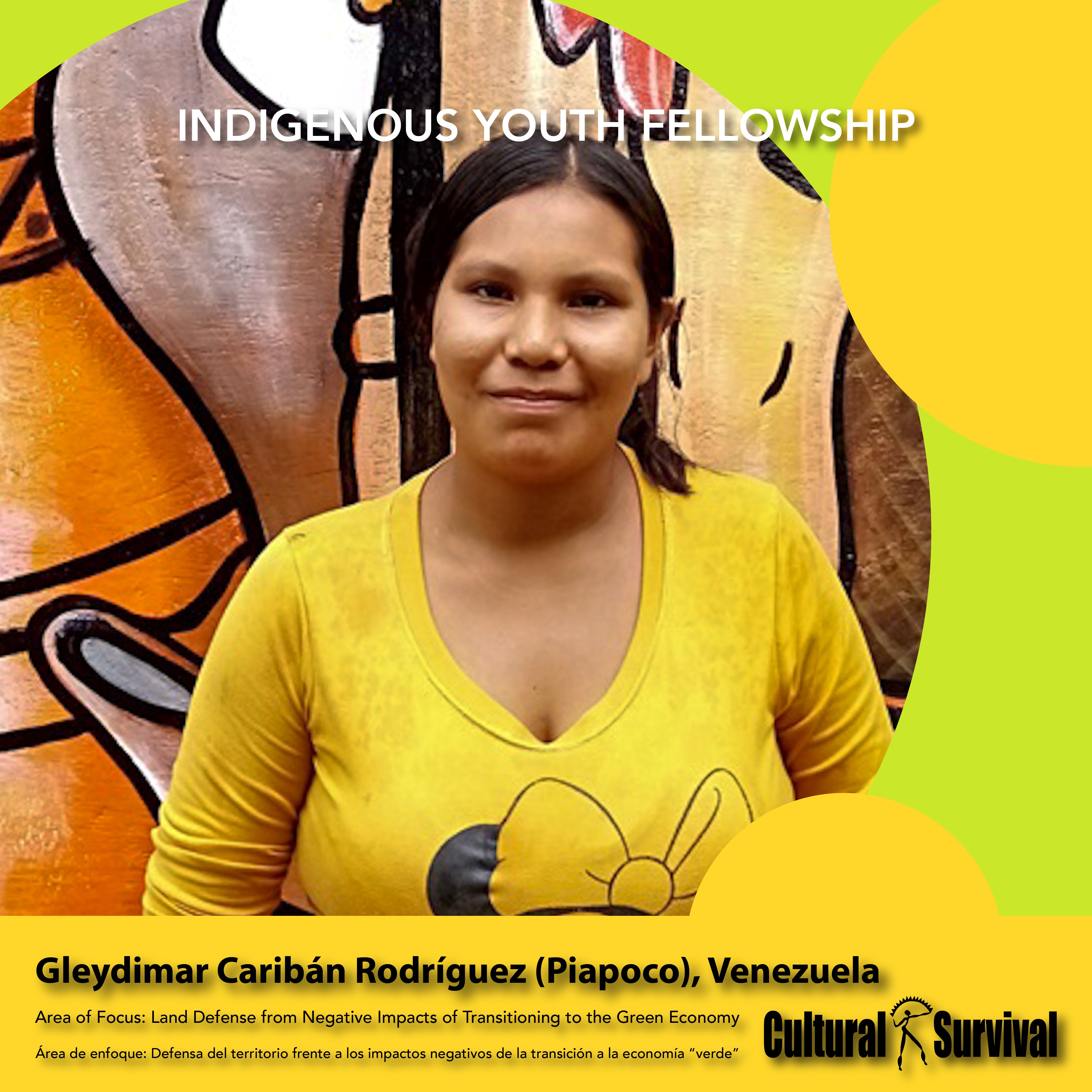 Gleydimar Caribán Rodrigquez, Piapoco, es de la comunidad Betel de Picatonal, del estado Amazonas en Venezuela. Estudió en la UE María Teresa del Toro, de la comunidad de Picatonal. Su comunidad se ha visto muy afectada por las explotaciones mineras, que han dañado la biodiversidad y el ecosistema en el que crecieron sus abuelos. Quiere abogar por la conservación del medio ambiente para los niños y las generaciones futuras.