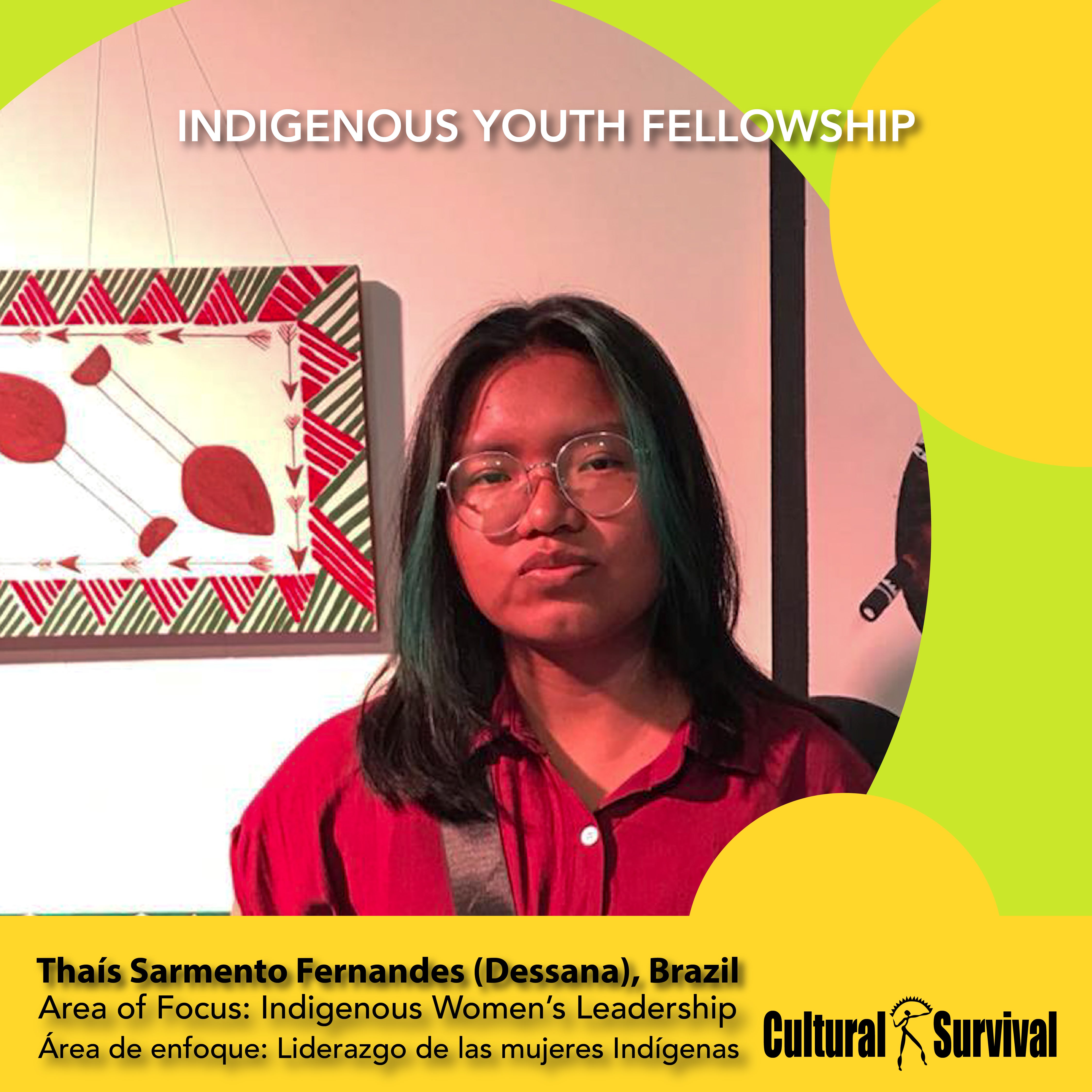 Thaís Sarmento Fernandes procede del pueblo de Dessana, en el estado brasileño de Amazonas. Es diplomada en Trabajo Social y actualmente cursa un máster en Antropología Social en la ciudad de Manaus/AM. Miembro del Colectivo Miriã coordinación Mahsã de Pueblos Indígenas LGBTQIA+ de Amazonia y Coordinadora del Departamento de Juventud Indígena de la Red Makira E ́ta. Dentro de sus estudios, el activismo trabaja en la línea de defensa de los derechos y la acogida de los Jóvenes Indígenas y LGBTQIA+.