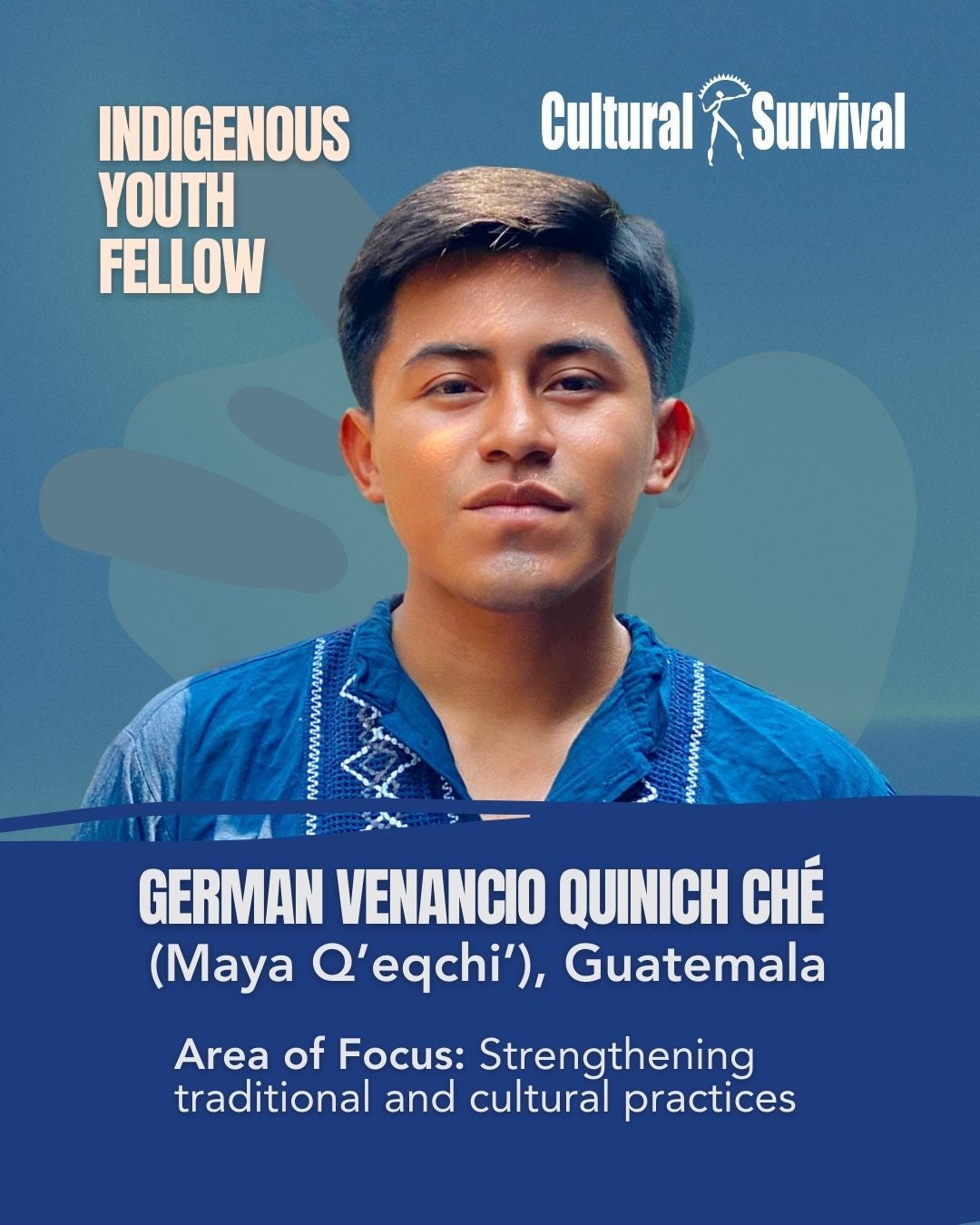German Venancio Quinich Ché es un activista Maya Q'eqchi de Guatemala dedicado a la protección del medio ambiente y los derechos colectivos de los Pueblos Indígenas. Tras crecer en una comunidad de pescadores, Germán se licenció en Administración y ahora defiende el lago que le proporcionó educación y sustento. Lucha contra una empresa minera que amenaza el lago y las montañas y valles circundantes, una lucha que ha provocado la violencia, el encarcelamiento y la persecución de quienes defienden su tierra. El proyecto de Germán, "Arte Ancestral", pretende encontrar fuentes de ingresos innovadoras en el mercado textil y rescatar los tejidos ancestrales de la región. El proyecto también concienciará a la población en general sobre los tejidos, ya que cada hilo significa lucha y resistencia.