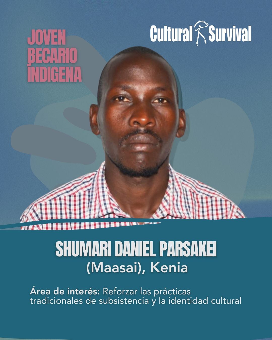 Shumari Daniel Parsakei es un joven Maasai de la comunidad Maasai de Kenia. Participa activamente en organizaciones juveniles de Trans Mara, en el condado de Narok, y acaba de licenciarse en Conservación Medioambiental y Gestión de Recursos Naturales por la Universidad de Nairobi. Shumari trabaja como oficial de Extensión y Coordinación a nivel comunitario, donde se compromete con los jóvenes de la comunidad, facilitando programas sobre agricultura sostenible en respuesta a la menor disponibilidad de tierras en el hogar, promoviendo la transferencia de Conocimientos Tradicionales intergeneracionales y abordando cuestiones relacionadas con el cambio climático. El proyecto de Shumari, "Mejora del acceso de los jóvenes a los recursos reproductivos, la conservación del medio ambiente y la promoción de la cultura", apoyará a los jóvenes Indígenas Maasai de Transmara, en el condado de Narok. El proyecto proporcionará recursos y conocimientos para ayudarles a afrontar los retos relacionados con el cambio climático, el acceso a los recursos reproductivos y la brecha en la transferencia intergeneracional de conocimientos. Esto se logrará mediante la formación sobre la propiedad de la tierra, la mitigación del cambio climático y la conservación del medio ambiente. Además, el proyecto facilitará el diálogo con líderes comunitarios, ancianos, mujeres y jóvenes en reuniones abiertas para debatir cuestiones culturales y garantizar la transferencia de conocimientos intergeneracionales.