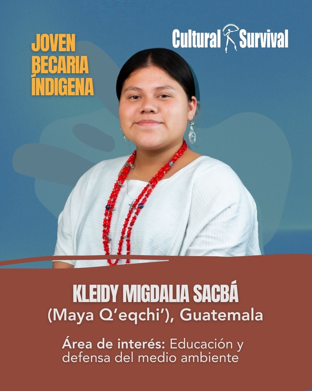 Kleidy Migdalia Sacbá Coc es una mujer maya q'eqchi' de Guatemala. Posee múltiples títulos y ha sido reconocida por su labor en la promoción de los derechos Indígenas y la protección del medio ambiente. Es experta en recursos naturales con enfoque en sostenibilidad y actualmente estudia Ingeniería Agronómica. Ha participado en diversos foros y cursos relacionados con cuestiones medioambientales y liderazgo transformacional. Es miembro de la Coalición Regional por el Derecho a Vivir en un Ambiente Sano en Centroamérica y trabaja para Conexión Icco Latinoamérica, promoviendo el desarrollo y empoderamiento de jóvenes y mujeres Indígenas. También participa activamente en iniciativas medioambientales como campañas de reforestación y defensa de la libertad del agua. Además, Kleidy ha trabajado en proyectos de adaptación al cambio climático y promueve la participación juvenil y la aplicación de una Ley Nacional de Juventud en Guatemala, haciendo hincapié en la importancia de la acción socioambiental para las generaciones futuras. Está llevando a cabo el proyecto "Q'eqchi' Xnimal Ruhil Chaq'rab'", una plataforma digital de educación medioambiental que pretende informar a la población sobre cuestiones medioambientales.
