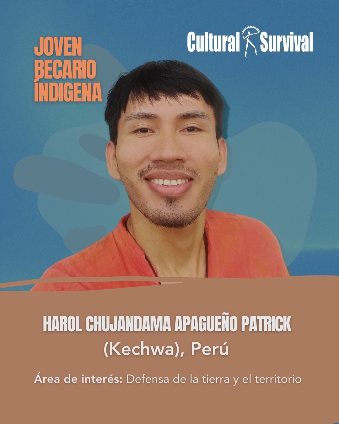 Harol Chujandama Apagueño Patrick pertenece al pueblo kechwa de la Amazonia peruana. Se ha implicado activamente en el apoyo a su comunidad y a la organización FEPIKECHA (Federación de Pueblos Indígenas Kechua Chazuta Amazonas), participando en diversas formaciones e iniciativas. Harol también se dedica a la creación de redes, la defensa y la organización de eventos para apoyar los derechos de los Indígenas y la conservación de los bosques. Cultural Survival apoya el proyecto de Harol, "Visibilizar para resistir: protegiendo a los defensores del Bajo Huallaga", que pretende arrojar luz sobre los problemas que viven las comunidades del Bajo Huallaga en relación con la defensa de su territorio para fortalecer su resistencia frente a las amenazas mediante la unión de esfuerzos entre la sociedad civil y el Estado.