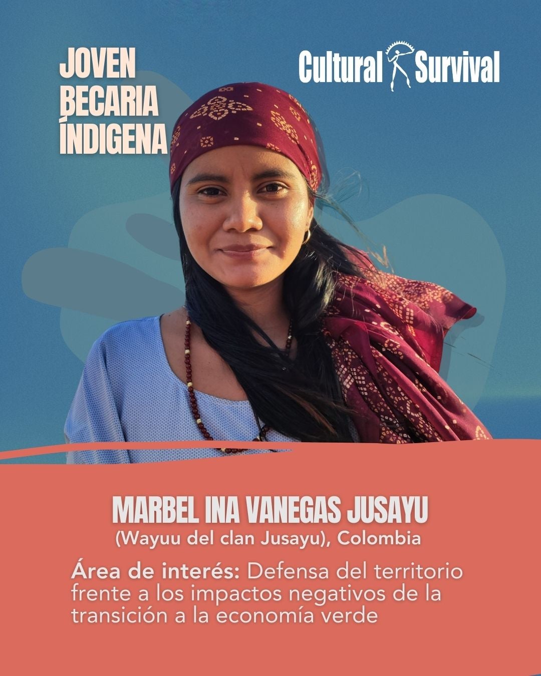 Marbel Ina Vanegas Jusayu es wayuu de la comunidad e'iruku. Es comunicadora comunitaria indígena con énfasis en audiovisuales. Es egresada del conservatorio de cine de la Escuela Nacional de Cine y de la Escuela de Comunicaciones Wayuu Putchimaajana de la Guajira. Marbel es directora y productora de contenidos audiovisuales para cine y televisión, y cuenta con amplia experiencia en organizaciones Indígenas en radio y cumplimiento técnico para la implementación de la política pública de comunicación indígena en Colombia. Con el apoyo de Cultural Survival, está implementando el proyecto "Ishoshi/Territorio rojo" para grabar el primer informe audiovisual sobre la construcción de un parque eólico en la comunidad Wayuu de Apotnojushi en el departamento de La Guajira.