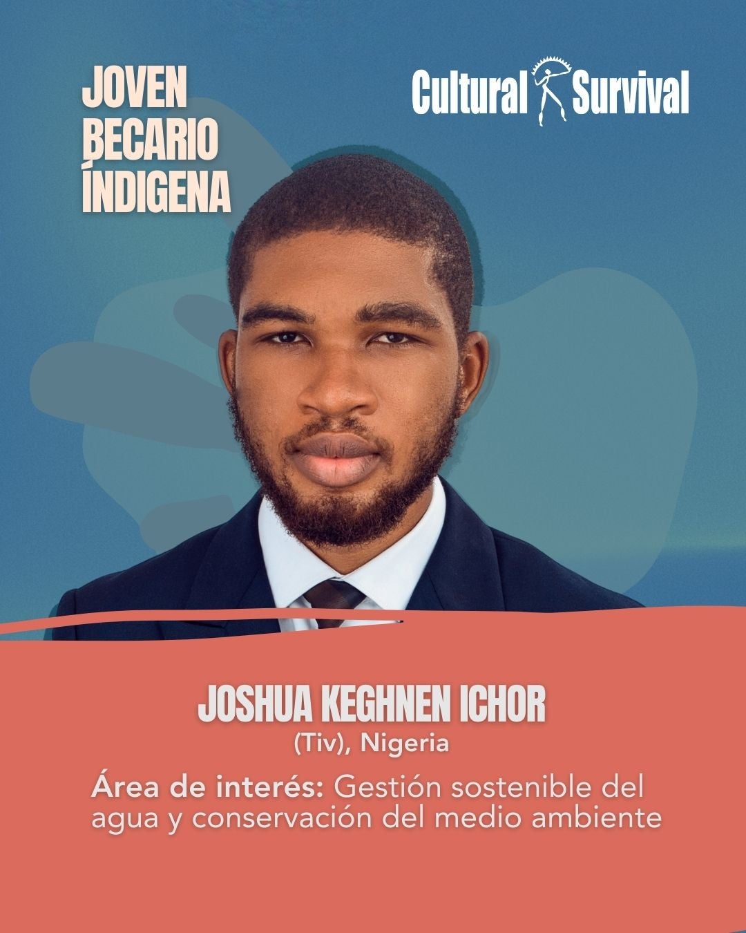 Joshua Keghnen Ichor es un geólogo y experto en agua de la comunidad Tiv de Nigeria. Ha dedicado su vida a abordar la escasez de agua y el cambio climático en el África subsahariana. Apasionado por la sostenibilidad medioambiental y el impacto social, se ha centrado en aprovechar la tecnología para la gestión sostenible del agua y la conservación del medio ambiente. Joshua fundó Geotek, una organización pionera en soluciones innovadoras para el tratamiento del agua, la supervisión de infraestructuras, la exploración de aguas subterráneas y la adaptación al cambio climático. También participa activamente en iniciativas de promoción y formación para concienciar y capacitar a las comunidades locales en materia de sostenibilidad medioambiental. El trabajo de Joshua se extiende por todo el mundo, ya que colabora con organizaciones internacionales, instituciones de investigación y agencias gubernamentales para impulsar el progreso en el campo del agua y la resiliencia climática. Sus esfuerzos han sido reconocidos con prestigiosos galardones, entre ellos el Young Climate Prize y el Swarovski Creative Prize. Cultural survival apoya su proyecto "The Geotek Water", dirigido fundamentalmente a la tribu Tiv y otras comunidades afectadas del norte de Nigeria para crear un sofisticado sistema de control y gestión del agua impulsado por la tecnología.
