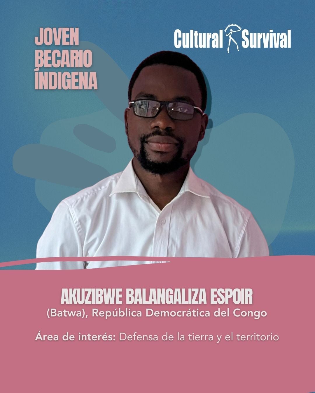 Akuzibwe Balangaliza Espoir es un joven defensor de los Pueblos Indígenas de la República Democrática del Congo. Es coordinador de la Red Espacio Climático, que reúne a varias organizaciones de Pueblos Indígenas y de la sociedad civil del este de la RDC. También es delegado juvenil de la Unión Africana en la RDC y Embajador de Paz y Clima de Peace World International. Espoir ha participado activamente en proyectos e iniciativas de promoción de los derechos de los Pueblos Indígenas a nivel nacional, regional e internacional desde 2017. Se centra especialmente en el voluntariado y la defensa de la protección de las personas desplazadas y el fortalecimiento de la cultura indígena a través del compromiso comunitario. Ha participado en varias conferencias, incluida la Cumbre sobre el Clima de África en Nairobi y la conferencia mundial sobre el clima para jóvenes en Tanzania. La participación de Espoir en la COP28 de Dubai le permitió contribuir a las negociaciones internacionales sobre la defensa de los derechos de los Pueblos Indígenas. Su proyecto, "La promotion et la vulgarisation des briquettes produites à base des biomasses" (La promoción y la vulgarización de las briquetas producidas a partir de biomasa), promueve las briquetas de biomasa como fuente de energía alternativa a la deforestación en las comunidades Indígenas Bambote y Batwa de la aldea de Fizi, en la provincia de Sud Kiv, en respuesta al Objetivo de Desarrollo Sostenible 7.