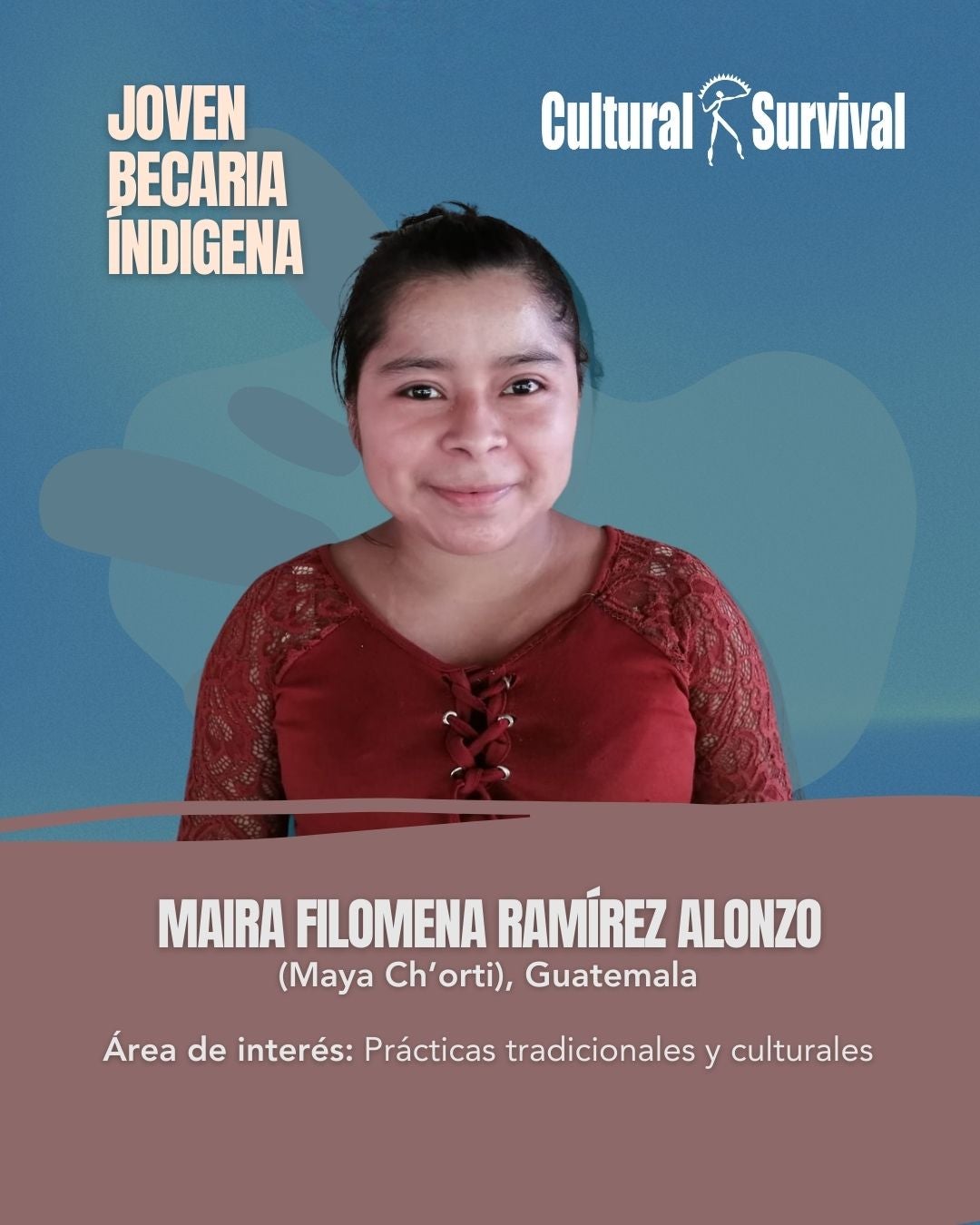 Maira Filomena Ramírez Alonzo es Maya Ch'orti' de Olopa Chiquimula, Guatemala. Es artesana, defensora de los derechos humanos, comunicadora comunitaria y forma parte del Consejo Indígena Maya Ch'orti' de Olopa. Ha participado en la organización comunitaria, incluida la recuperación de tierras, bosques, ríos, fuentes de agua y la preservación de su cultura. Maira participa activamente en la resistencia contra la explotación de la tierra por parte de las empresas mineras, así como en la defensa de los derechos y el bienestar de su comunidad a escala local, nacional e internacional. Es una apasionada de la conservación de su patrimonio cultural, en concreto de la elaboración artesanal de productos de fibra de maguey con tintes naturales, una tradición transmitida por su madre y sus abuelas. Cree que las prácticas de su pueblo pueden contribuir a resolver problemas globales como el cambio climático. Su proyecto, "Rescate de nuestras raíces y conocimiento de la artesanía de maguey del pueblo Maya Ch'orti", pretende recuperar los conocimientos ancestrales del pueblo Maya Ch'orti' de la comunidad de Tituque Olopa, Chiquimula.