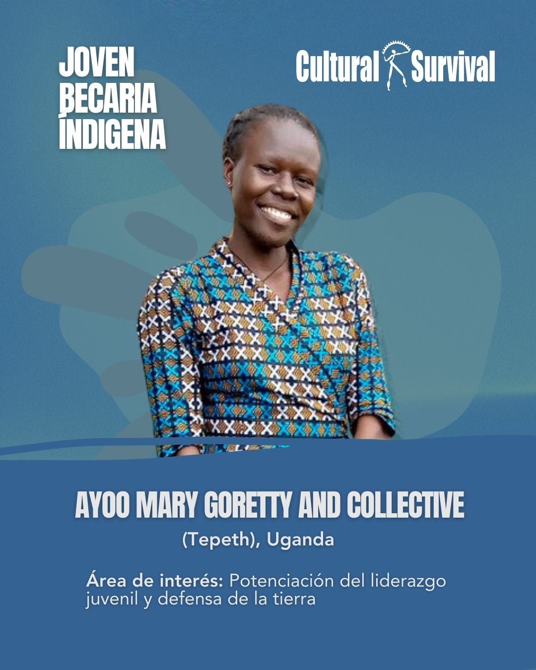 Ayoo Mary Goretty procede de la comunidad de Tepeth, en el distrito de Moroto. Es defensora y trabajadora para el desarrollo de la comunidad y participa activamente en diversas actividades comunitarias. Le encanta relacionarse con los jóvenes, especialmente con las personas con discapacidad. Ayoo se siente inspirada por la voluntad de su comunidad de aprender y transformarse en ciudadanos responsables que aprecian sus tradiciones tepeth.
