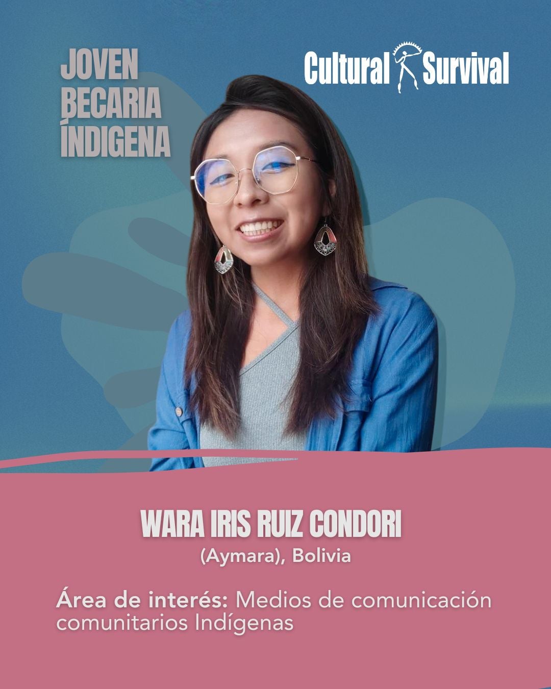 Wara Iris Ruiz Condori es una mujer Aymara que trabaja como coordinadora de proyectos sobre justicia climática y biodiversidad para los Pueblos Indígenas a nivel internacional, regional y local. Es estudiante de periodismo ambiental, gracias al apoyo de Grupos Internacionales de Trabajo en Asuntos Indígenas. Además, es becaria de International Land Coalition (2023), Latin American Youth Climate Scholarship (2023), Changemakers for Change for the Planet (2023), DCN Global (2022), Slow Food Youth Network (2022) y Young Leaders of Americans Initiatives (2022). Su proyecto, "PACA", es una iniciativa que pretende reforzar las competencias en periodismo y comunicación medioambiental y las herramientas digitales para preservar los conocimientos, la mitología, los testimonios y las crónicas de las mujeres y los jóvenes Indígenas.