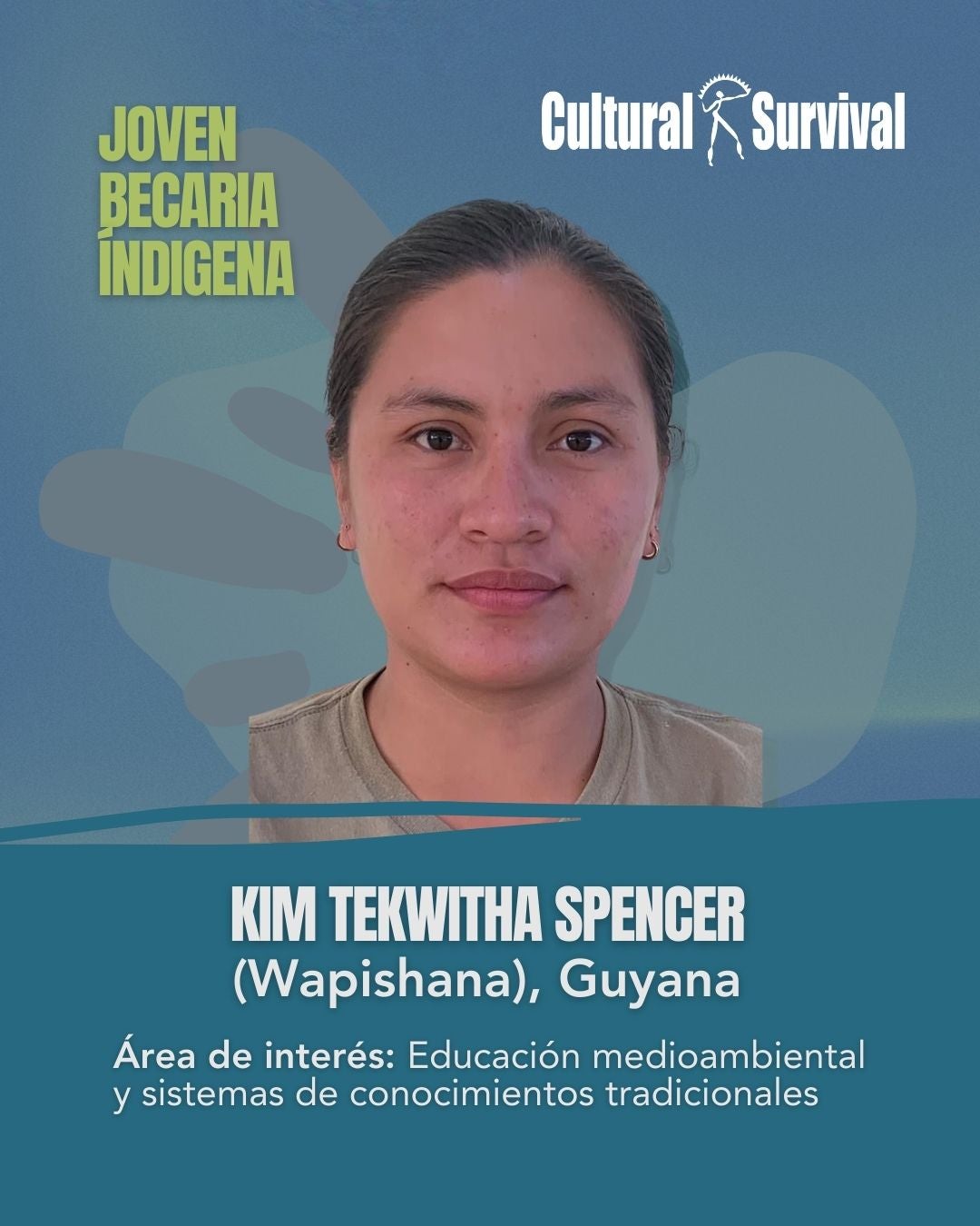 Kim Spencer es una joven wapishana profundamente conectada con la naturaleza y apasionada por la conservación del medio ambiente. Sus esfuerzos en conservación y educación son testimonio de su inquebrantable pasión y compromiso con el medio ambiente. La dedicación de Kim a la preservación de la cultura y las tradiciones Indígenas brilló a través de su trabajo como guardabosques cadete en la South Rupununi Conservation Society, donde defendió incansablemente las voces de su pueblo para proteger su modo de vida. También trabaja para su comunidad como profesora de matemáticas en la escuela secundaria de Sand Creek, donde ha inculcado a sus alumnos el cuidado del medio ambiente dirigiendo expediciones a la naturaleza para enseñarles la gestión de la fauna y el equilibrio de los ecosistemas. El proyecto actual de Kim consiste en crear espacios educativos seguros y atractivos para los niños Indígenas con el fin de aumentar sus conocimientos sobre cuestiones medioambientales, desarrollar sus capacidades, practicar sus oficios tradicionales e inspirarlos para que sigan roles de liderazgo relacionados con el medio ambiente y sus habilidades tradicionales.