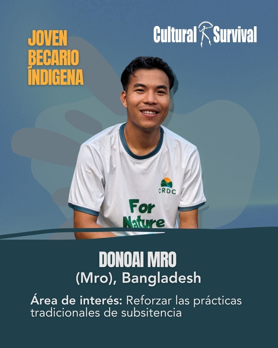 Donoai Mro, natural de Chittagong Hill Tracts (Bangladesh), procede de una familia de agricultores. Es licenciado en Criminología por la Universidad de Dhaka, con especialización en delitos contra el medio ambiente. Siente una profunda pasión por la sostenibilidad y le encanta estar cerca de la naturaleza. También es un líder juvenil en alza en su comunidad y actualmente ejerce de Secretario de Información y Publicaciones en la Asociación de Estudiantes Mro de Bangladesh. Donoai ha desarrollado el proyecto "tui'piya", palabra Mro que significa utilización de los conocimientos Indígenas, mediante el cual utilizará los conocimientos tradicionales Indígenas para preservar los arroyos de Chittagong Hill Tracts. El proyecto de Donoai consiste en mejorar la resiliencia comunitaria dotando a la comunidad Mro de conocimientos, habilidades y recursos para prevenir y responder eficazmente a las catástrofes exacerbadas por el cambio climático.