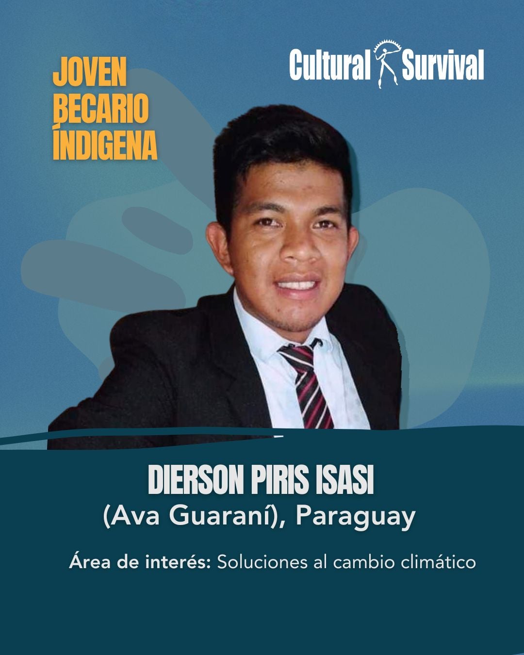 Dierson Piris Isasi es de la comunidad Mytuy en Curuguaty, Paraguay. Trabaja como profesor en las escuelas de su comunidad, donde se esfuerza por inculcar los valores tradicionales de sus raíces a sus alumnos, a los que llama cariñosamente sus hermanos. Actualmente, Dierson cursa el último año de Derecho. Le mueve la pasión por luchar por los derechos de su pueblo tras ser testigo de la discriminación y el maltrato institucional que sufrió de niño. Su proyecto, "Reforestación y Educación Ambiental", promueve la reforestación y la educación ambiental en la comunidad de Mytuy.