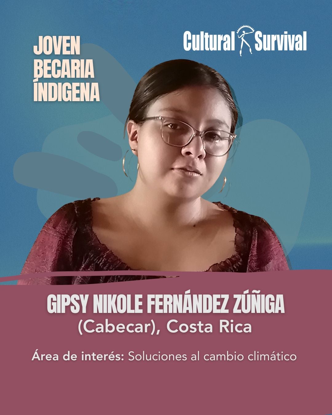 Gipsy Nikole Fernández Zúñiga es de la comunidad Cabecar de Ujarrás, Buenos Aires, Puntarenas, Costa Rica, y actualmente estudia Gestión de Recursos Naturales en la Universidad Estatal de Costa Rica. Le apasiona la naturaleza y cree que toda acción positiva cuenta para su conservación. Su proyecto, "Soluciones de cambio climático relacionadas con sistemas sostenibles", pretende implementar prácticas para reducir las emisiones y garantizar la sostenibilidad del planeta.