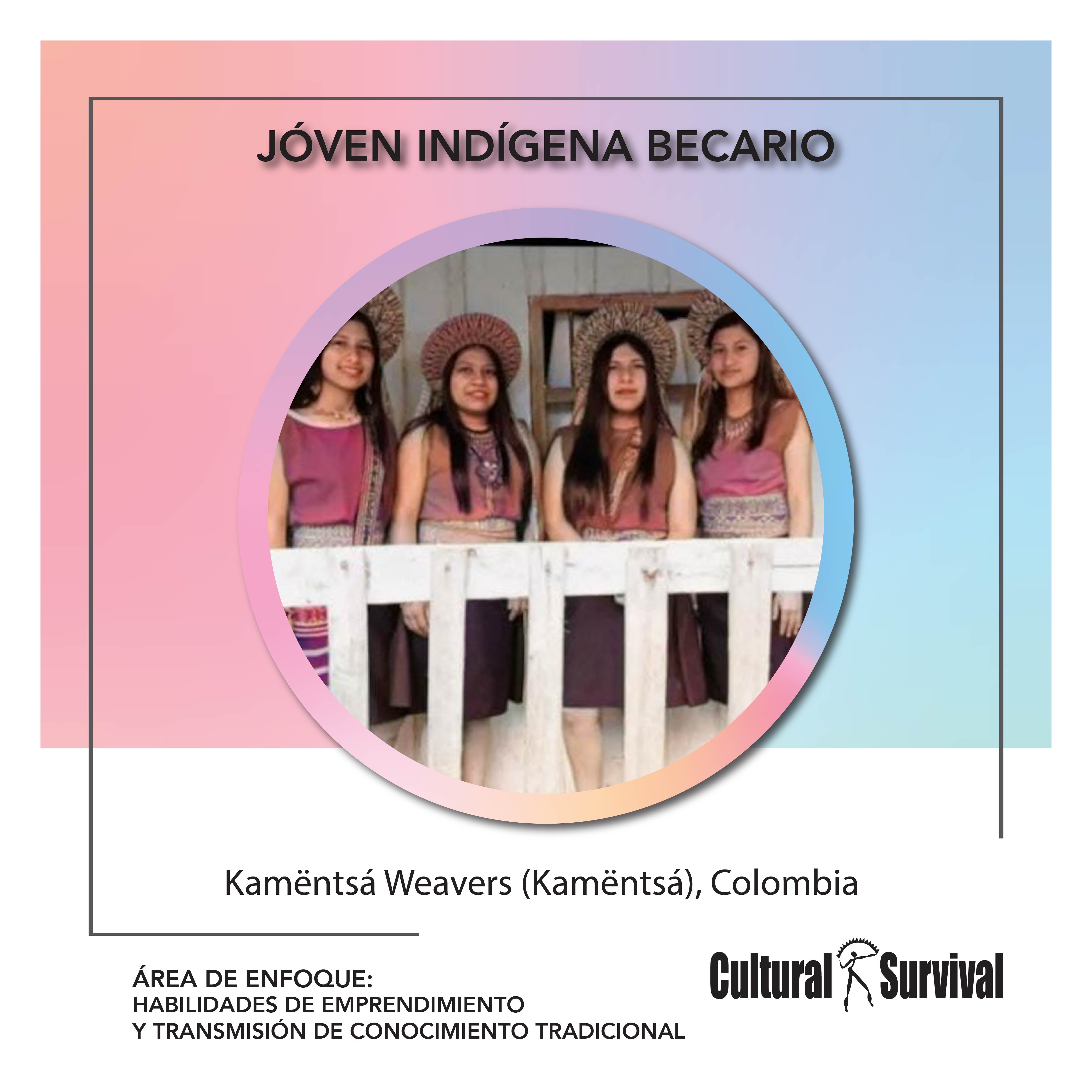 Leydi Johana, Nelly Adriana y Erika Viviana (Kamëntsá) son de la comunidad Indígena Kamëntsá del municipio de San Francisco, departamento de Putumayo. Son conocidos como los Tejedores Kamëntsá que se formó con el propósito de fortalecer las técnicas tradicionales de tejido que promuevan la cultura y las expresiones artísticas de los Pueblos Kamëntsá para las próximas generaciones. La participación de sus familias ha sido fundamental en este proceso, ya que esta transmisión de conocimientos les ha permitido tejer sus propias historias, pensamientos y sanaciones a través de los hilos.