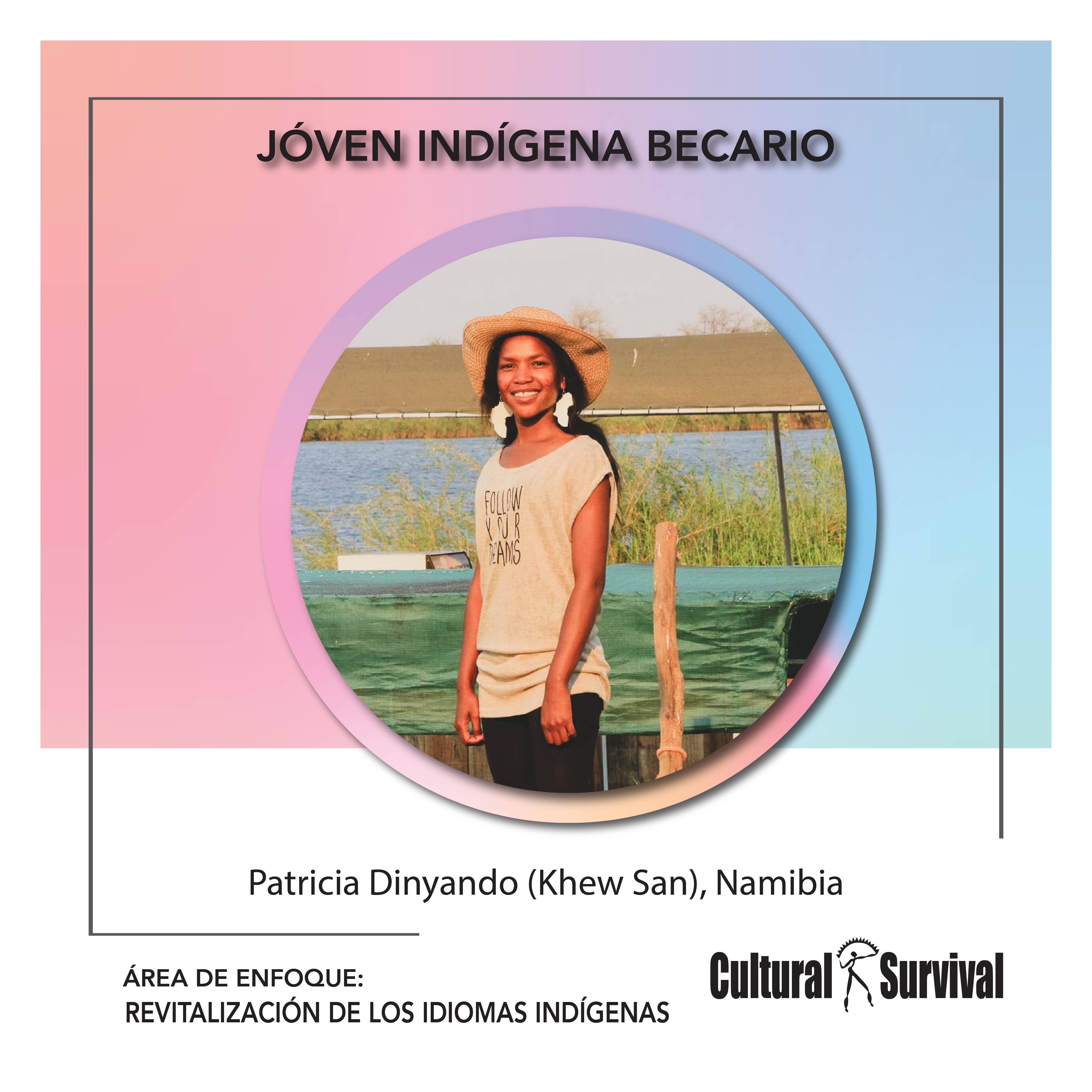 Patricia Dinyando es una estudiante de tercer año en la Universidad de Namibia, cursando una licenciatura en Educación. Proveniente de la comunidad Khwe San, Patricia es una dedicada y motivada mujer joven. En los últimos cinco años, se ha ofrecido activamente como voluntaria en el Centro de Liderazgo de Mujeres, contribuyendo a su misión de empoderar a las mujeres para que activamente participen en la conformación de la política. Además, Patricia se desempeña como facilitadora de Young grupo San Women and San Girls, donde desempeña un papel vital en el empoderamiento y apoyo a estas mujeres.