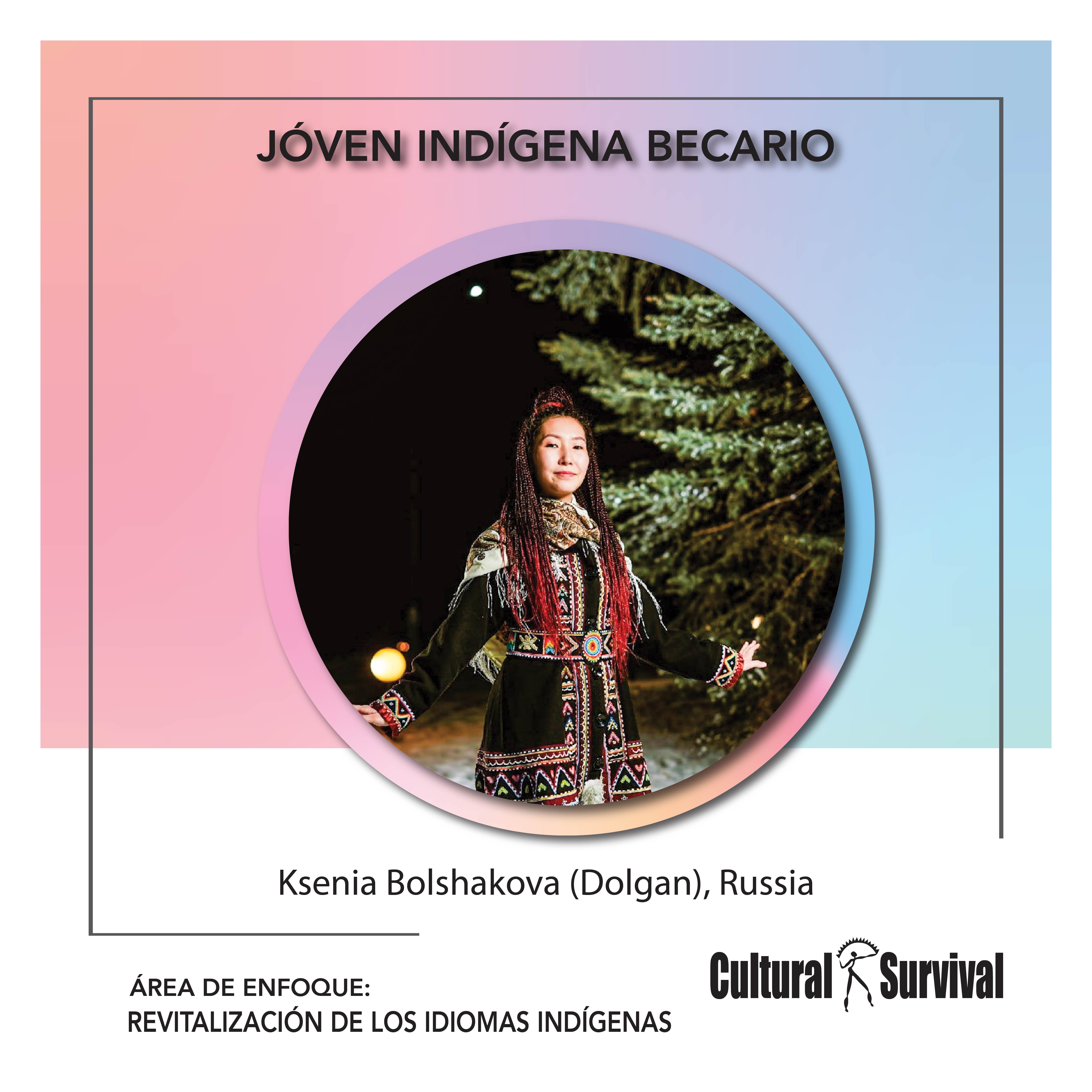 Kseniia Bolshakova (Dolgan) es una activista de idiomas y escritora, miembro de la Comunidad tribal Dolgan Yydyna (“Claro de Luna” en Dolgan). Kseniia nació y creció en el asentamiento dolgan de Popigay en la península Taymir en el norte de Siberia. El trabajo de Keniia está enfocado en la revitalización de idiomas de Siberia y el lejano oriente. Actualmente trabaja como Content Manager de la aplicación para el aprendizaje del idioma Yakut “Sahalyy” como un editor de léxico en base de datos y diccionario electrónico del idioma Chukchi. ambién es asistente de codificación de datos lingüísticos en el idioma Kumandy en Dartmouth College.