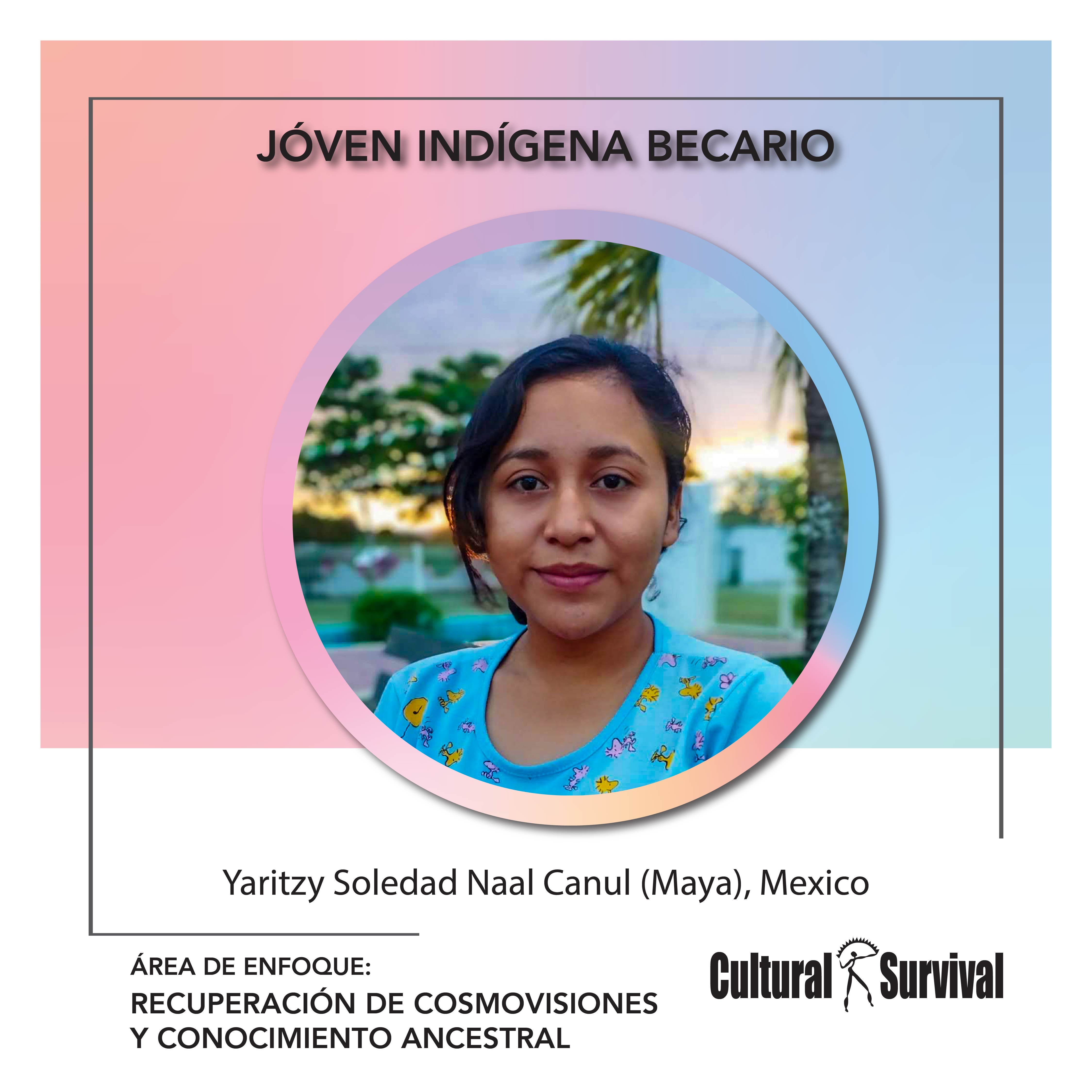 Yaritzy Soledad Naal Canul (Maya), nació en José María Morelos, Quintana Roo en México. Ha transcurrido toda su infancia en este municipio. Actualmente estudia la carrera de ingeniería en sistemas de producción agroecológicos en la Universidad Intercultural Maya de Quintana Roo (UIMQROO). Una joven campesina y estudiante, a unos meses de acabar la carrera antes mencionada, son campesinos, ellos, menciona Yartizy, son su motivación en su caminar y cada uno de sus aprendizajes en el campo se los debo a ellos y al grupo de campesinos integrantes de la Milpa Colectiva KM50, inspirados y acompañados por la organización Ka’ Kuxtal Much Meyaj A.C. de Hopelchén, Campeche.