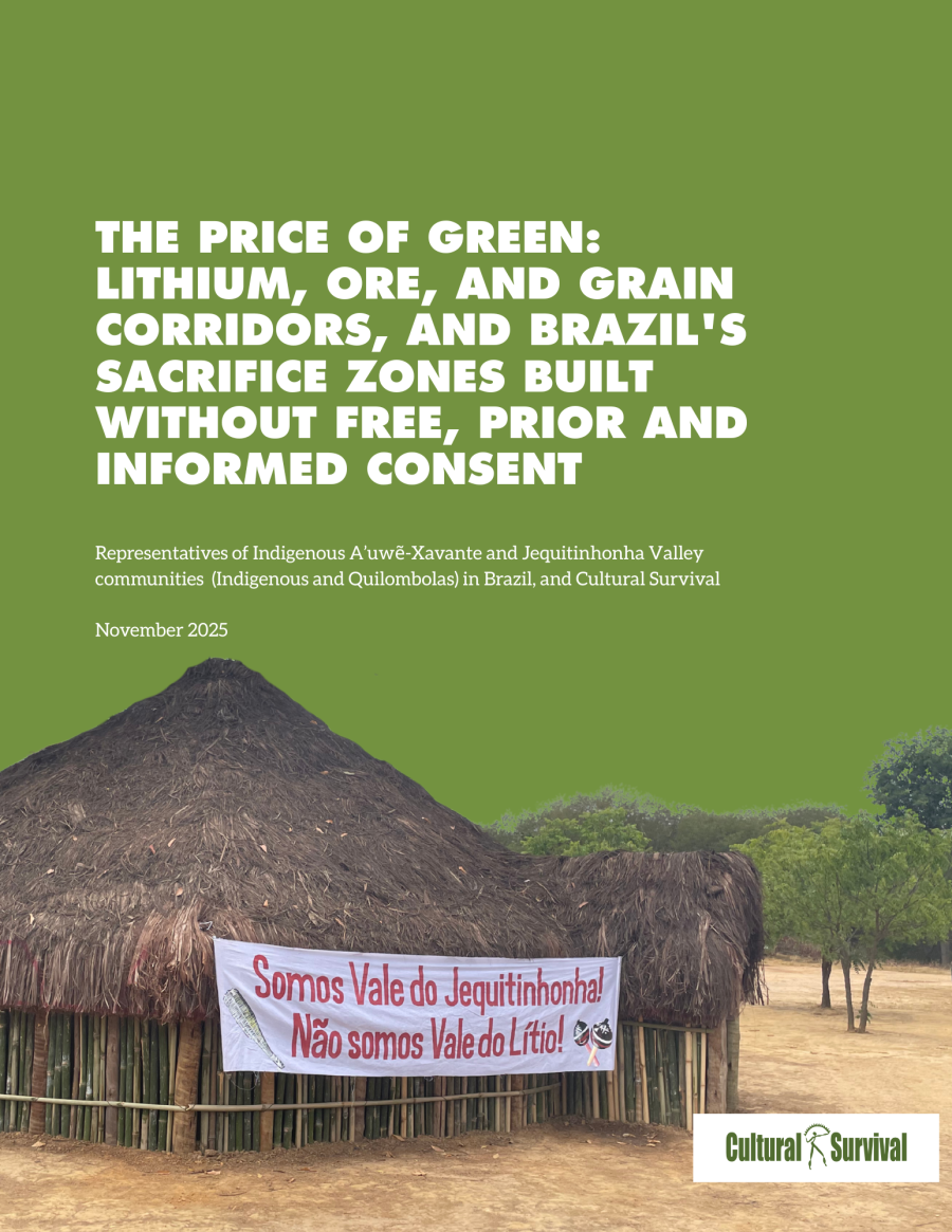 Cultural Survival lanzó el informe "El Precio de lo Verde: Litio, Corredores de Minerales y Granos, y las Zonas de Sacrificio de Brasil Construidas sin Consentimiento Libre, Previo e Informado" en la COP do Povo, un espacio alternativo para que los Pueblos Indígenas y la sociedad civil discutan y reflexionen juntos sobre sus luchas con los efectos del cambio climático. El texto presentó estudios de caso sobre la violación de los derechos de los Pueblos Indígenas y Quilombolas bajo el discurso de transición energética y desarrollo, como el complejo Grota do Cirilo de Sigma Lithium en el Valle del Jequitinhonha y el ferrocarril FICO en el Cerrado, revelando cómo estos emprendimientos reconfiguran territorios, cuerpos vividos y modos de existencia frente a la expansión de la minería, agronegocios y proyectos de infraestructura a gran escala.