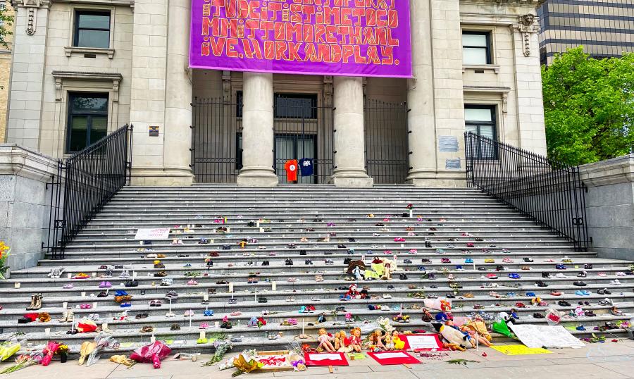 Despite these painful truths, the tone of Cancel Canada Day was solution-oriented and future focused. On a live feed of a rally in Vancouver, virtual attendees heard Audrey Siegel give a powerful address. She called out to a carefully-distanced crowd of rain-soaked Indigenous and non-Indigenous attendees: “Any benefits that you have that come at my expense, I need you to give them up and I need you to do it now… We want to rise with you, we want to heal with you, we want to do it in a way that Canada cannot do.” Naming human rights violations from police brutality, addiction stigma, epidemics, and the reservation school system, Siegel continued, “We know what it’s like to be pushed aside and forgotten and we will not let that happen to anyone.”