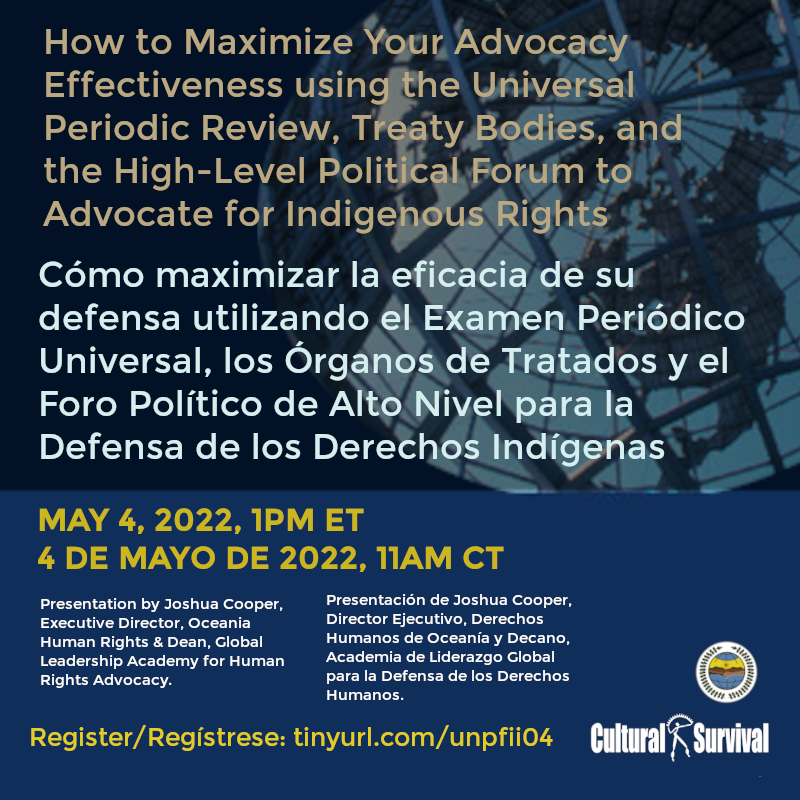 Come learn about international human rights mechanisms, including the Universal Periodic Review (UPR) and UN Treaty bodies, the High-Level Political Forum on Sustainable Development (HLPF), Paris Agreement Nationally Determined Contributions after HLPF, and how they can aid in your advocacy efforts and put pressure on governments, locally, nationally, and globally, to respect Indigenous Peoples’ rights.