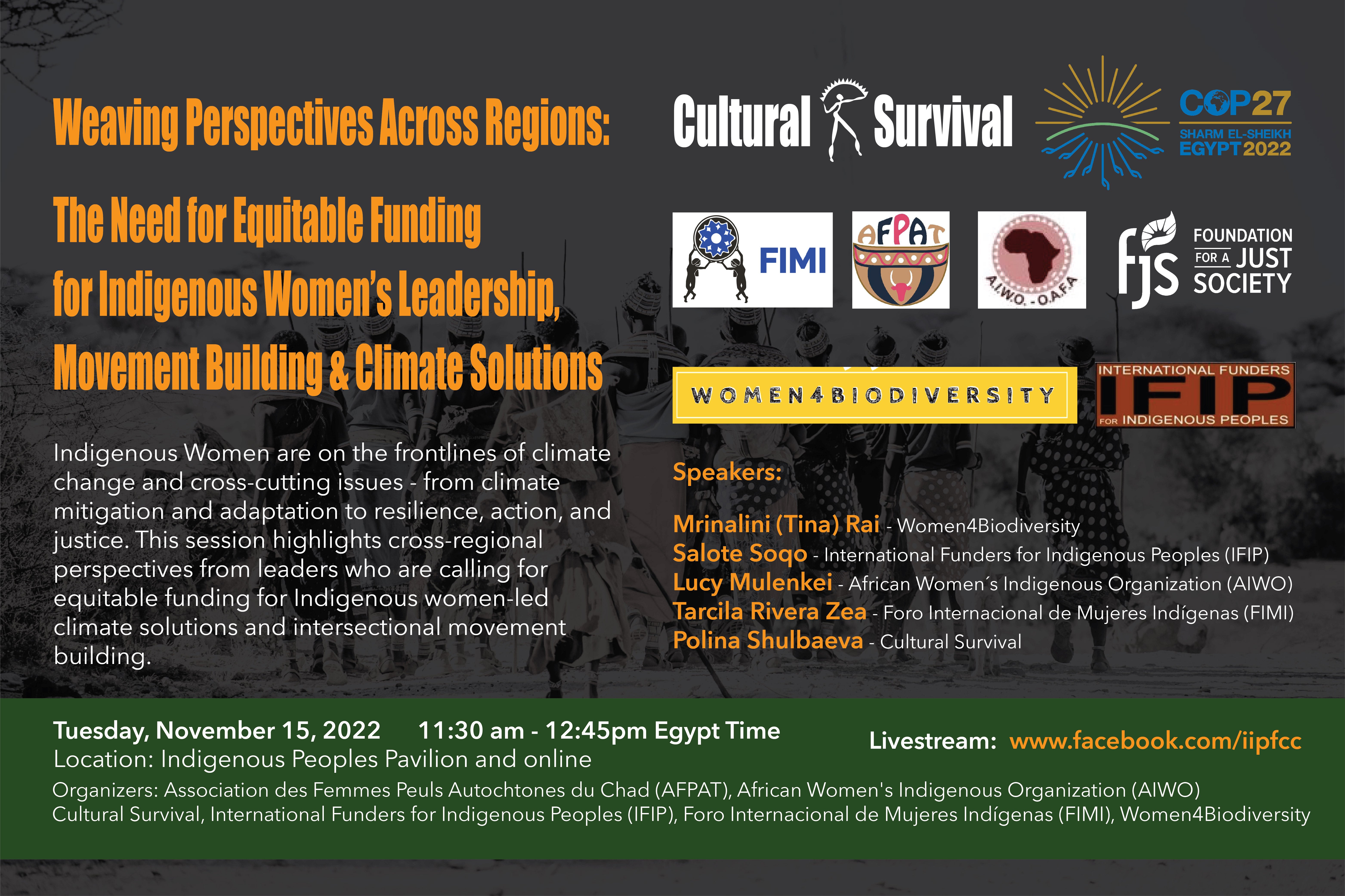 Organizers: Association des Femmes Peuls Autochtones du Chad (AFPAT), Cultural Survival, International Funders for Indigenous Peoples (IFIP), Foro Internacional de Mujeres Indígenas (FIMI), African Women's Indigenous Organization (AIWO), Women4Biodiversity