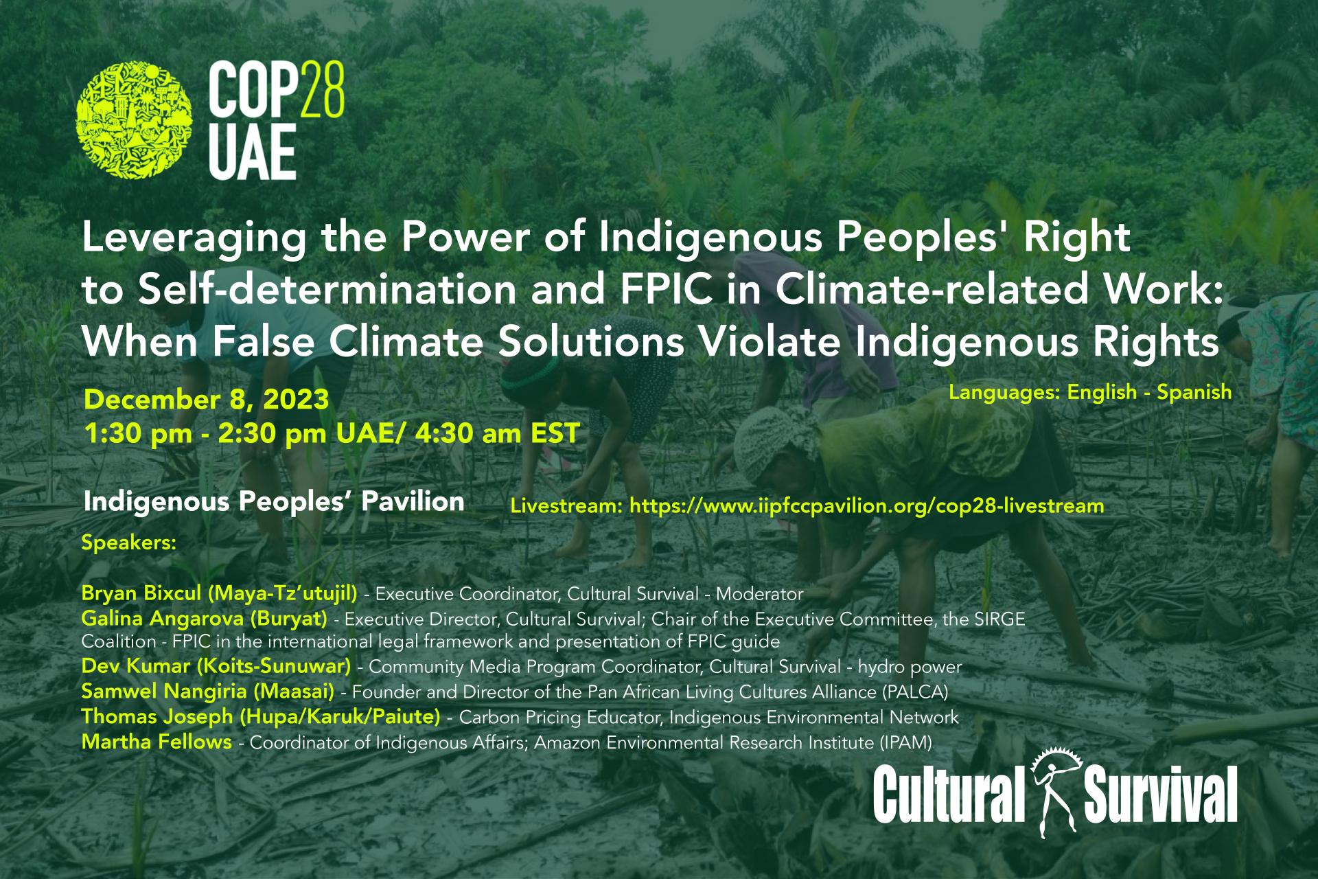 Cultural Survival and partners developed an FPIC guide to support Indigenous Peoples' right to self-determination worldwide. As we continue to witness an onslaught of violations of Indigenous territories in the name of conservation, the just transition, and extractive industries, exercising the right to Free, Prior and Informed Consent remains one of the most powerful tools to protect the rights of Indigenous Peoples. At this session, Indigenous leaders will share experiences of violations of Indigenous rights and will present a new FPIC guidebook to support Indigenous Peoples' self-determination.