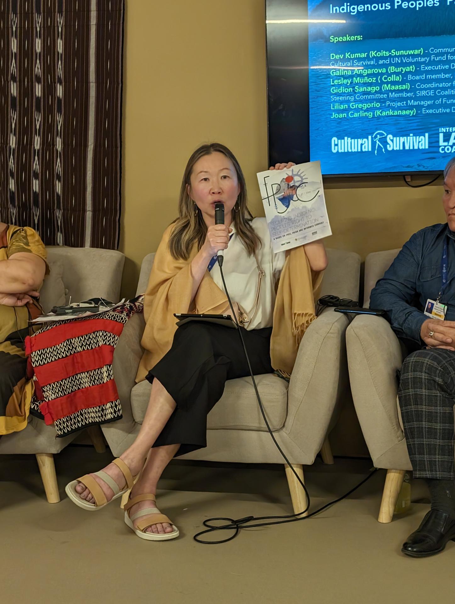 “Transition is inevitable, justice is not. So, we have to make justice a central part of this transition. Otherwise we will be doing business as usual,” said Galina Angarova (Buryat), Executive Director of Cultural Survival, commenting during a panel focused on the role of the banking sector in the Just Transition. “Indigenous leadership and stewardship cannot happen with the status quo, which continues to provide less than one percent of nature and climate finance [to Indigenous Peoples]. This number is disproportionate, with Indigenous Peoples playing a crucial role in managing 80 percent of the world’s biodiversity. The real solution for biodiversity conservation and climate change mitigation and adaptation is supporting Indigenous Peoples’ self-determination.”