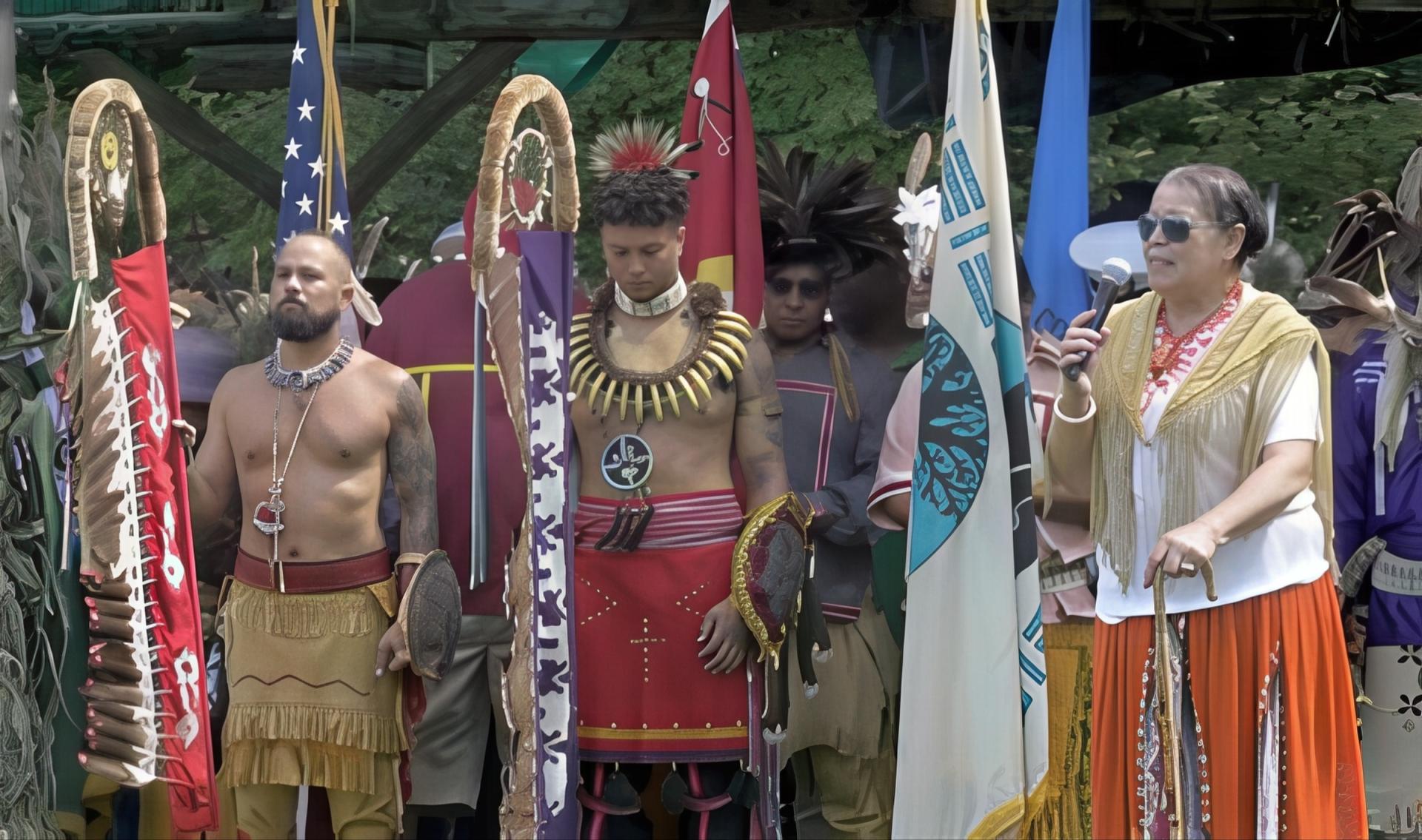 Mujer curandera Mashantucket Pequot, “Mujer que Ríe”, ofreciendo una oración mientras los portadores de bandera se preparan para entrar ceremonialmente al círculo, abriendo el espacio para todos los bailarines Schemitzun.