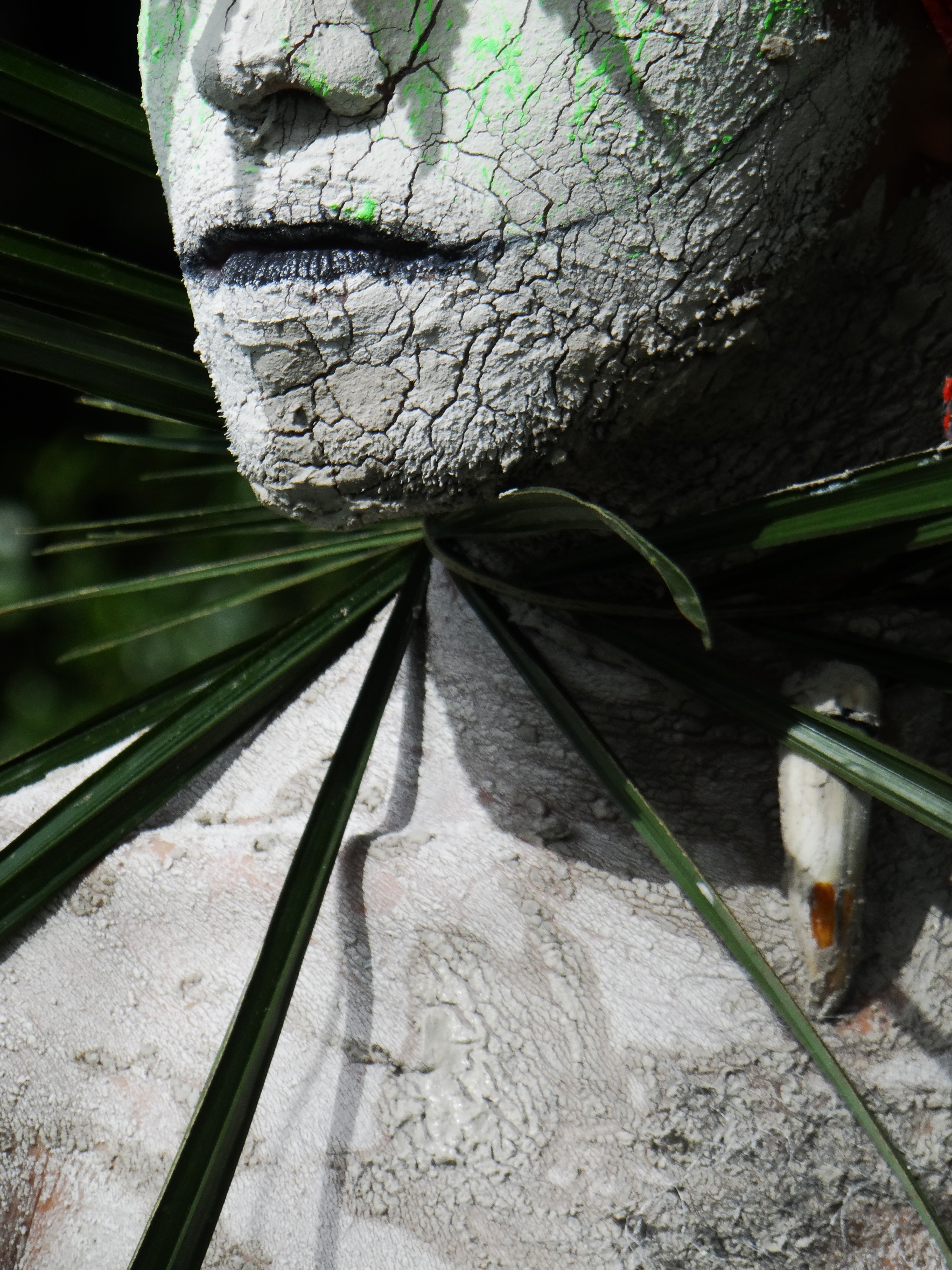 EU: Me muevo con una perspectiva anticolonial. Desde que recojo hojas para poner en mi cara, afirmo que también somos naturaleza. La perspectiva occidental eurocéntrica ha hecho por mucho tiempo un punto de separación de la naturaleza y la cultura, para nosotros los Pueblos Indígenas, la naturaleza y cultura son la misma cosa, somos naturaleza con cultura. Tenemos cultura y nuestra cultura es el bosque, un bosque vivo. No hay distinción entre nosotros. Las cosas están vivas, son hermanas, todas son hijas de la misma abuela. Reclamo ese lugar también, de una manera híbrida, no humana, no antropocéntrica. Así que hay muchos manifiestos directos anticoloniales presentes en mi trabajo. Y cada día aprendo a hacer esto mejor.