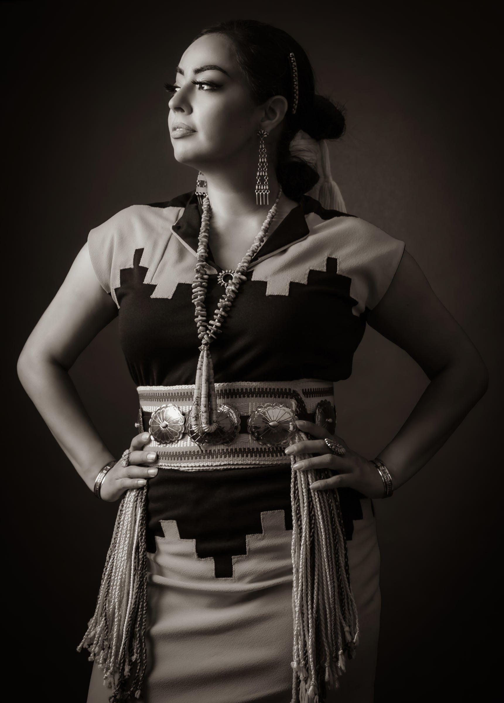 Retrato de la cantante / compositora / poeta de Tongva conocida como Kelly Caballero, rindiendo homenaje a sus antepasados, del Pueblo Originario de Tovaangar (Los Ángeles, CA). Foto de Pamela J. Peters, tachiiniiphotography.com.