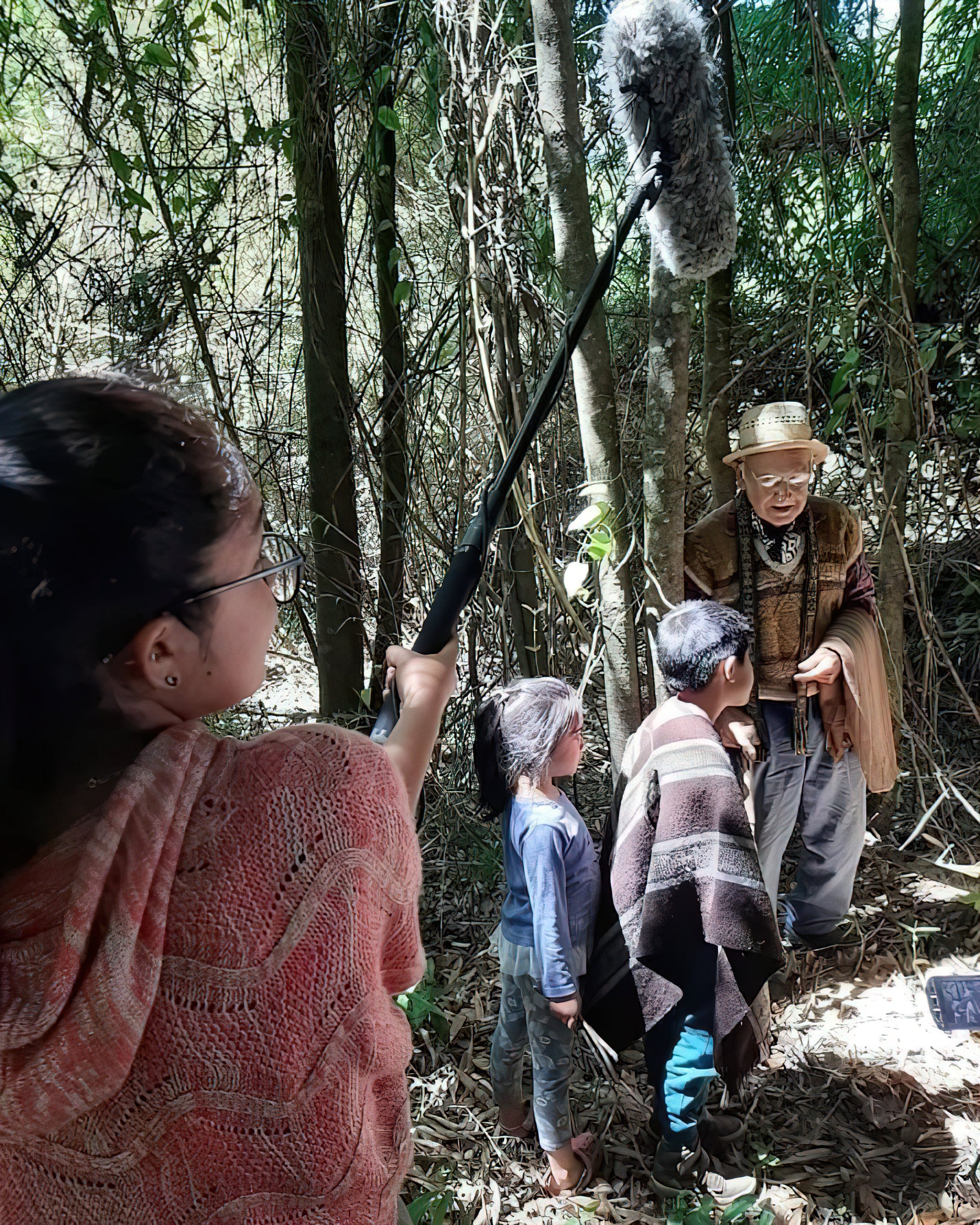Foto: Carolina Rain Ancan (mapuche) en el campo filmando a niños mapuche aprendiendo de un anciano. Foto cortesía de Carolina Rain Ancan.