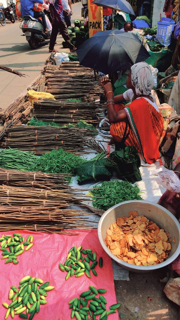 Mujeres indígenas vendiendo ramitas para datun (cepillos de dientes), rodajas de genthi (papa silvestre), verduras y hojas de sal en un mercado local, Jharkhand, India. Foto de Samarjeet Minz.