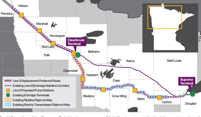 The Line 3 replacement pipeline was proposed by Enbridge in 2014 and is one of the largest projects of its kind in North America and the largest in the company’s history, with a $C5.3 billion component in Canada and $US2.9 billion American component. It is expected to carry more than 750,000 barrels of tar sands oil a day from Hardisty, Alberta to Superior, Wisconsin. This is a distance covering over 1000 miles that will run through wetlands with wild rice beds that Anishinaabe people depend on for food. The pipeline has faced legal opposition from three Anishinaabe communities including the Red Lake Nation, White Earth Band of Ojibwe, and Mille Lacs Band of Ojibwe. These communities along with environmental organizations have launched direct action against the Walz administration. Activists have chained themselves to heavy equipment, locked themselves inside a section of a pipe, blockaded roads and sat in trees to prevent them from being cut down. A sit-in protest was organized in the path of the construction in December 2020.